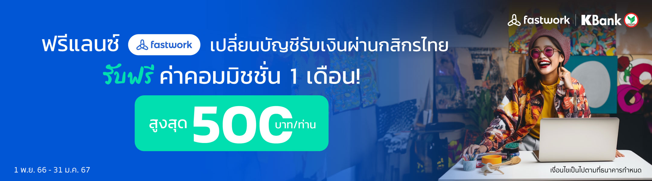 รับสิทธิ์ฟรีค่าใช้บริการระบบ ในทุกการจ้างงาน เป็นเวลา 1 เดือน (สูงสุด 500 บาท/ท่าน) ตั้งแต่วันแรกที่เข้าร่วมแคมเปญ เมื่อเปลี่ยนมารับเงินผ่านบัญชีเงินฝากธนาคารกสิกรไทยครั้งแรก