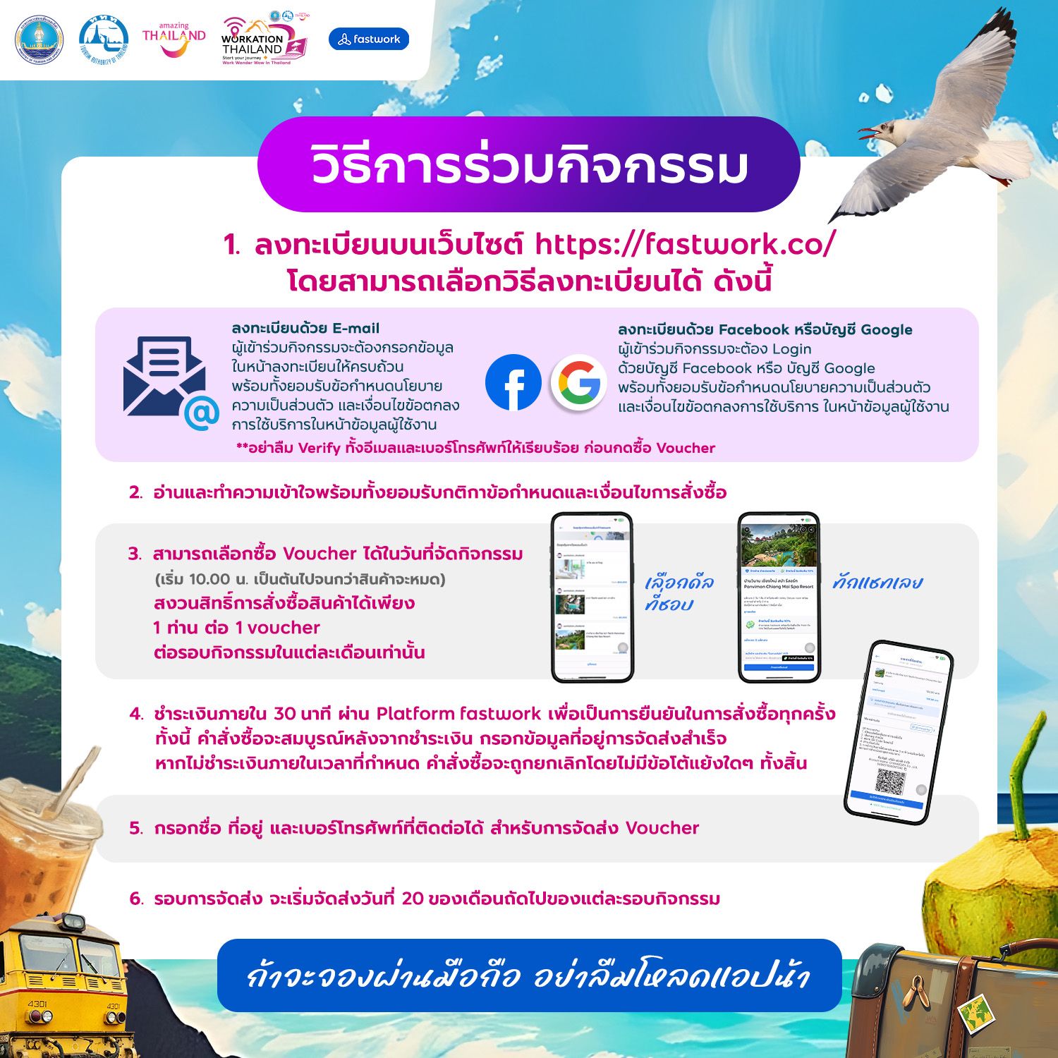 - ผู้เข้าร่วมกิจกรรมสามารถเลือกซื้อ Voucher ด้านการท่องเที่ยวบนระบบ fastwork ในราคา 100 บาท (สุทธิ) ได้เฉพาะวันที่ 25 กรกฎาคม 2568 และ 25 สิงหาคม 2568 โดยสามารถใช้สิทธิ์ในการซื้อ ได้เพียง 1 ครั้งต่อรอบกิจกรรมในแต่ละเดือนเท่านั้น