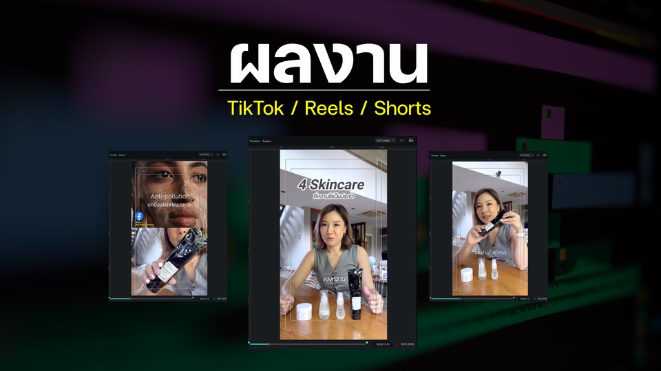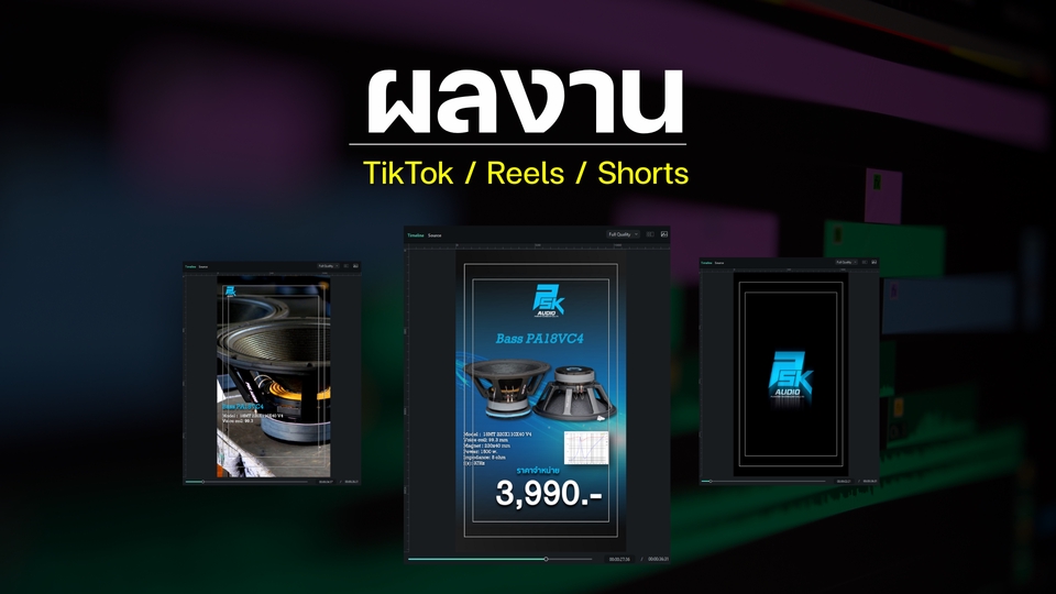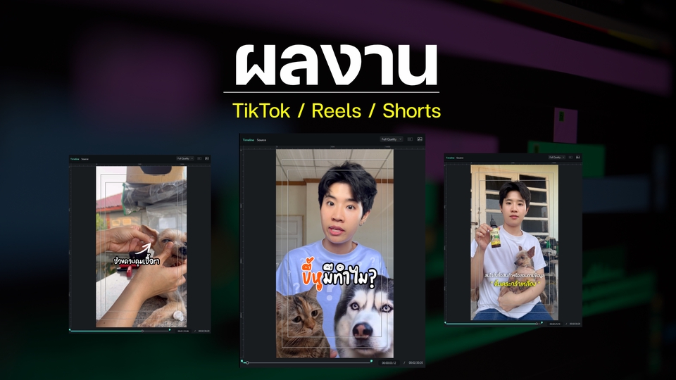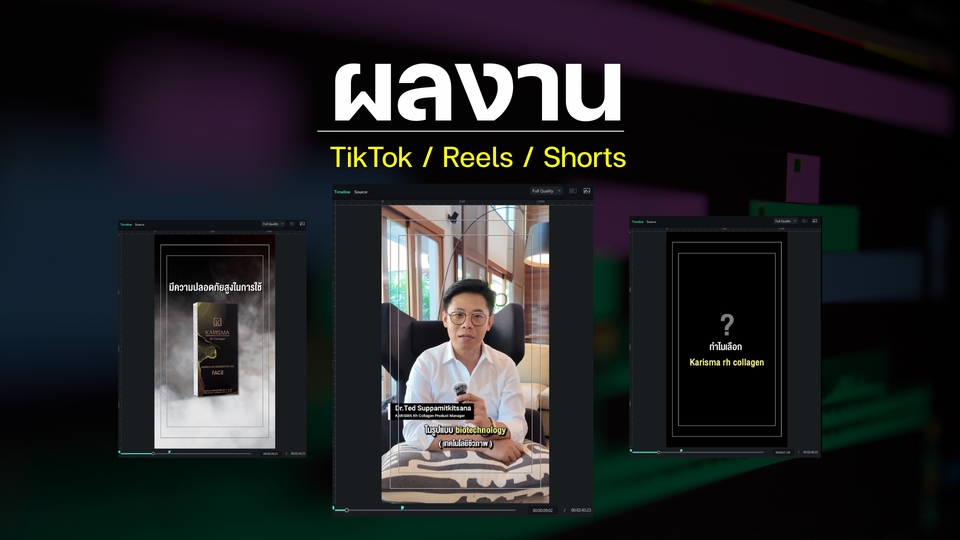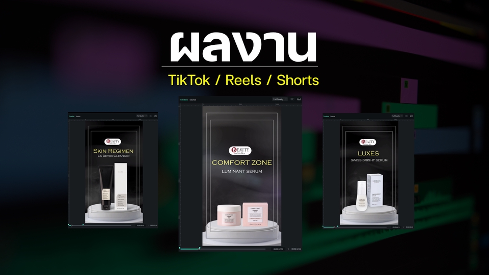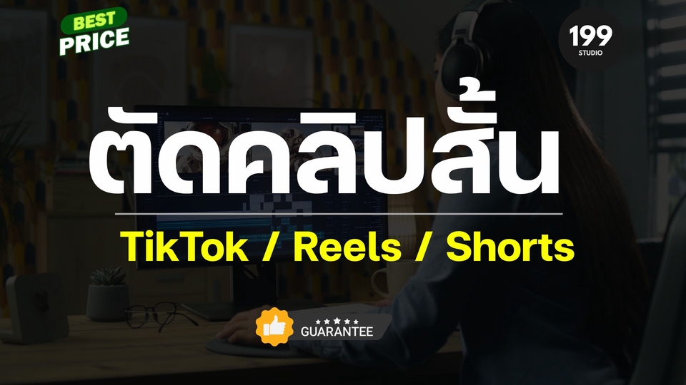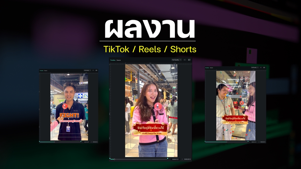 - • ตัดต่อวิดีโอจากไฟล์ที่ลูกค้าส่ง วิดีโอความยาวไม่เกิน ไม่เกิน 1 นาที 30 วินาที จำนวน 3 คลิป