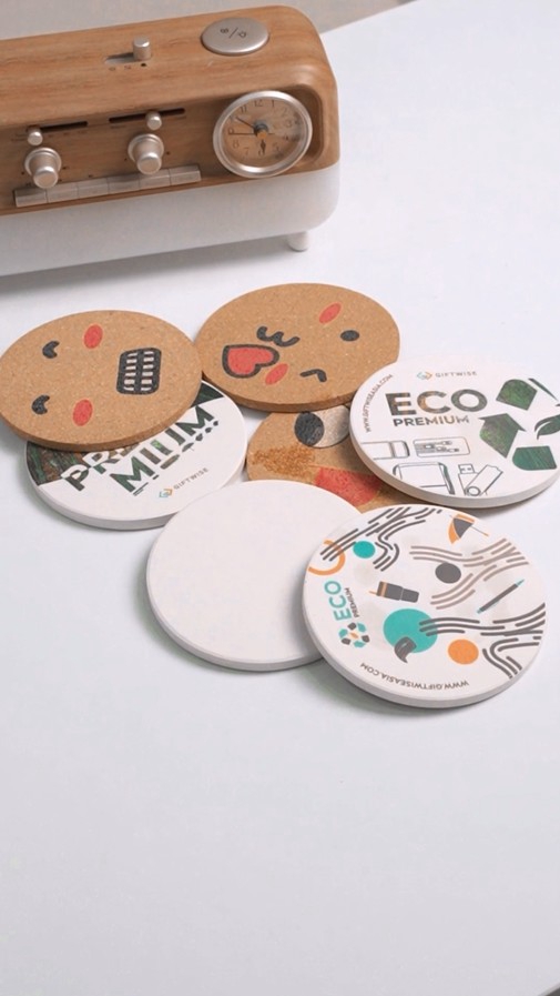 แผ่นรองแก้วเซรามิกซับน้ำ สีขาวล้วน ทรงกลมมีฐานรองทำจากไม้คอร์ก 15 ชิ้น
