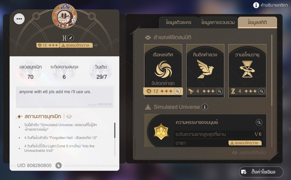 สวัสดีครับ ผมชื่อเอ็มนะครับ รับเล่นเกม Honkai Star Rail, Wuthering Waves, Zenseless Zone Zero, Genshin Impact หรือเกมอื่นๆสามารถสอบถามก่อนได้ครับ