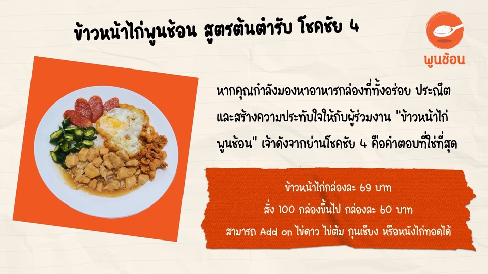 ข้าวหน้าไก่พูนช้อน - เจ้าดังย่านโชคชัย 4 พร้อมเสิร์ฟอาหารกล่องระดับพรีเมียม สำหรับงานเลี้ยงและสัมมนา หากคุณกำลังมองหาอาหารกล่องที่ทั้งอร่อย ประณีต และสร้างความประทับใจให้กับผู้ร่วมงาน “ข้าวหน้าไก่พูนช้อน” เจ้าดังจากย่านโชคชัย 4 คือคำตอบที่ใช่ที่สุด เราเชี่ยวชาญในการทำอาหารกล่องสไตล์โฮมเมดที่คัดสรรวัตถุดิบคุณภาพ สดใหม่ทุกวัน ใส่ใจในทุกขั้นตอนการทำ เหมือนทำอาหารให้คนที่เรารัก พร้อมกับ Packaging รักษ์โลก คุณภาพสูง บริการของเราเหมาะสำหรับ: • งานเลี้ยงบริษัท • งานประชุม สัมมนา • งานอบรม และเวิร์กช็อป • งานอีเวนต์ และงานพิเศษต่างๆ ทำไมต้องเลือกข้าวหน้าไก่พูนช้อน? • รสชาติอร่อยคงเส้นคงวา สูตรเฉพาะที่ครองใจลูกค้ามาแล้วนับไม่ถ้วน • คุณภาพระดับพรีเมียม ตั้งแต่ข้าวหอมมะลิชั้นดีจนถึงเนื้อไก่คัดเกรด • แพ็คเกจสวยงาม ดูดี พร้อมเสิร์ฟในทุกโอกาส • บริการตรงเวลา พร้อมส่งถึงที่ในสภาพสมบูรณ์ ไม่ว่าคุณจะมีผู้ร่วมงานกี่คน ทีมงานข้าวหน้าไก่พูนช้อนพร้อมดูแลทุกกล่องให้เต็มไปด้วยคุณภาพ และความใส่ใจเหมือนทำให้คนในครอบครัว “ข้าวหน้าไก่พูนช้อน — เพราะความอร่อยที่พูนเต็มช้อน คือความสุขที่เราอยากส่งต่อในทุกมื้อ” ขั้นตอนการทำงาน 1. ลูกค้าแจ้งเมนูและจำนวนที่ต้องการ รวมถึงสถานที่จัดส่ง อย่างน้อยล่วงหน้า 1 วัน 2. ทีมพูนช้อนทำอาหารสดใหม่และใส่บรรจุภัณฑ์อย่างดีเตรียมให้ลูกค้า 3. ทีมพูนช้อนจัดส่งให้ตามเวลาที่นัดหมาย