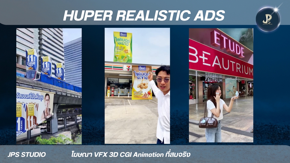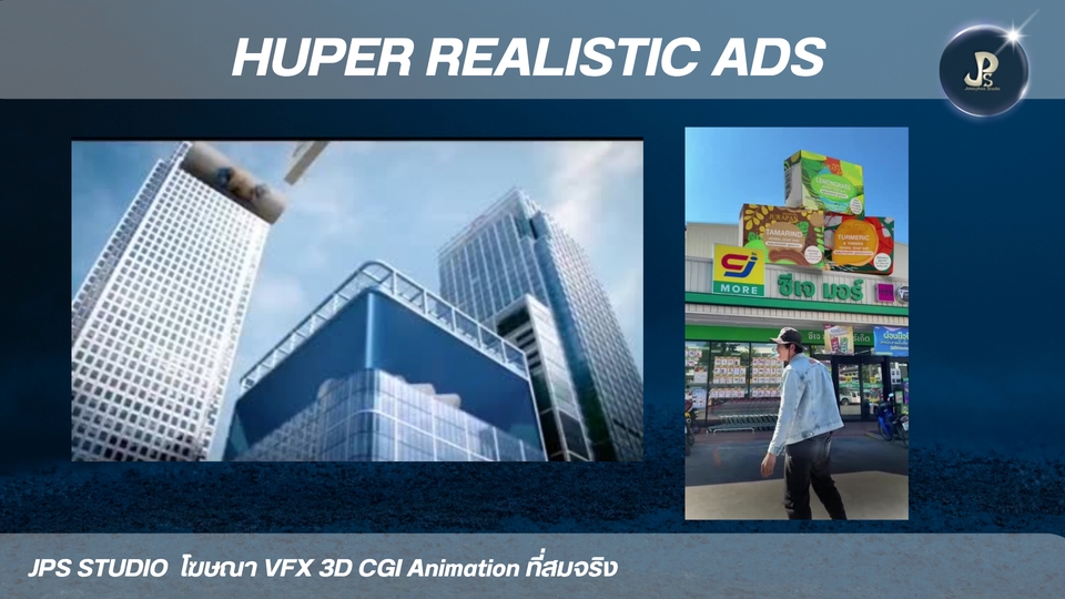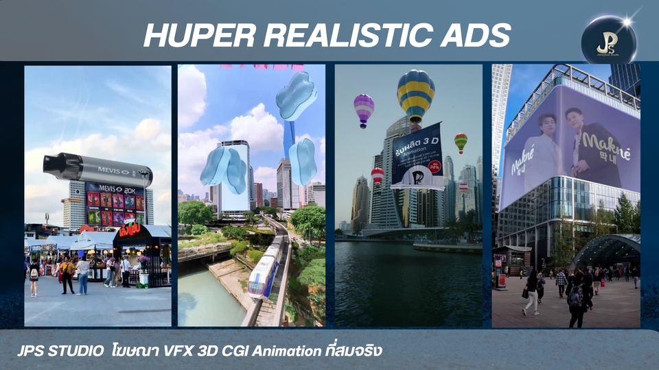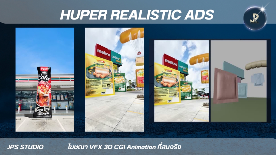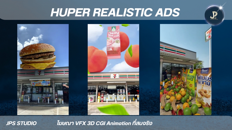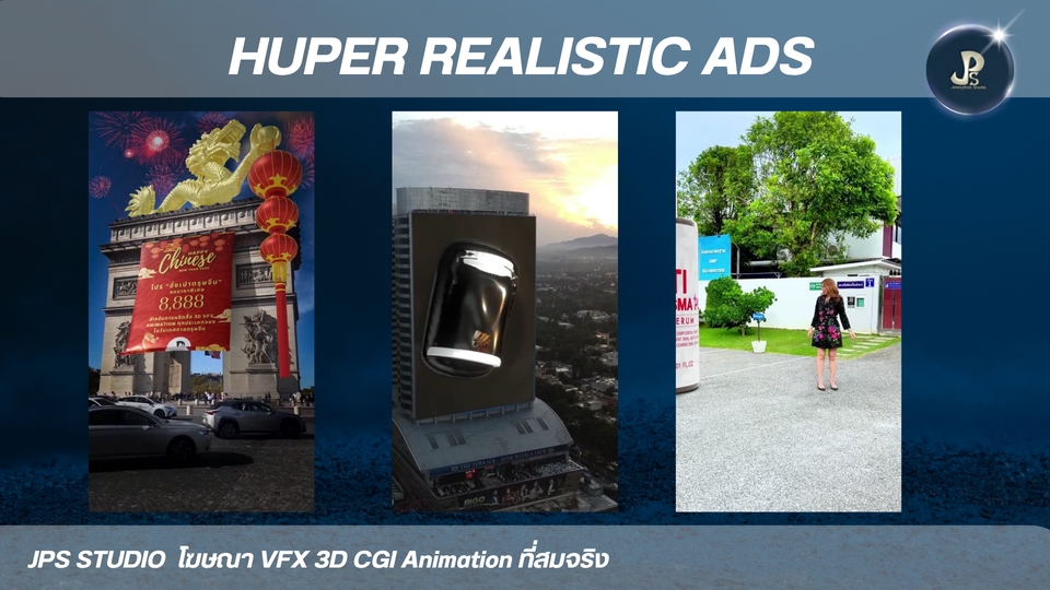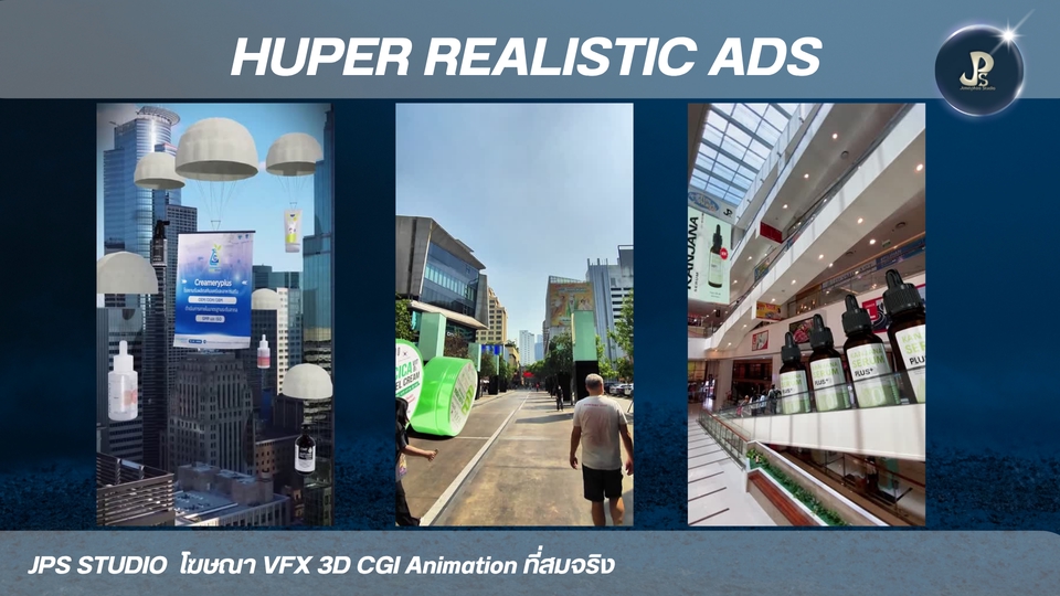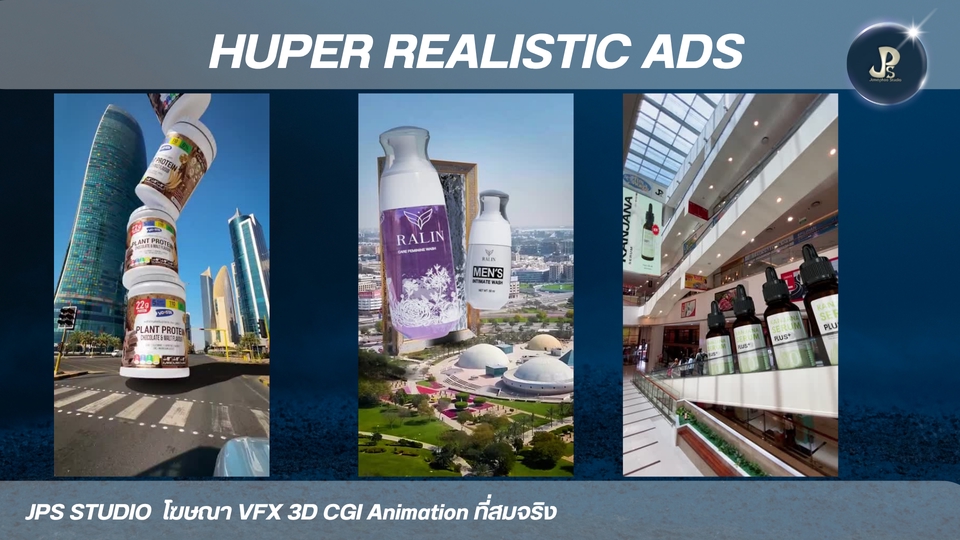 3D Animation CGL VFX Hyper Realistic Ad สื่อโฆษณาแบบใหม่ เป็นเอกลักษณ์และน่าประทับใจ ประสบการ์พร้อมให้บริการทุกความต้องการของคุณ 3D Animation VFX CGI เน้นสื่อสารการสร้างภาพจริงประกอบฉาก * 3D อนิเมชัน คือการสร้างภาพเคลื่อนไหวสามมิติในคอมพิวเตอร์ เหมือนกับพวกหนังการ์ตูนที่เราดูกัน * VFX หรือ Visual Effects คือเทคนิคพิเศษที่ใช้สร้างภาพหรือฉากที่ถ่ายทำจริงไม่ได้ เช่น ฉากระเบิด หรือสัตว์ประหลาดในหนัง * CGI หรือ Computer-Generated Imagery คือภาพที่สร้างขึ้นจากคอมพิวเตอร์ ซึ่งอาจจะเป็นส่วนหนึ่งของ VFX หรือใช้ใน 3D อนิเมชันก็ได้ครับ สรุปง่ายๆ คือ 3D อนิเมชันเน้นสร้างการ์ตูน VFX เน้นสร้างเทคนิคพิเศษ ส่วน CGI คือภาพที่สร้างจากคอมพิวเตอร์นั่นเองครั ผลงาน อัพเดท port https://jps-studio.my.canva.site/ ขั้นตอนการทำงาน 1. 3D animation. -3D CGI VFX Animation 2. ส่งตัวอย่าง Model สินค้า 3. เรื่องย่อ คลิปวีดีโอตัวอย่างที่อยากได้ การเคลื่อนไหวของชิ้นงาน 4. ส่งตัวอย่างสินค้า ขึ้น 3D ข้อมูลแบนรด์ลูกค้า เช่น dimension ขนาด ฉลากสินค้า Logo mood and tone