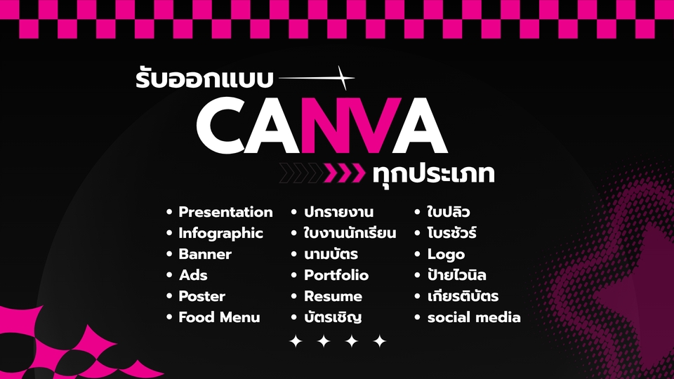 รับออกแบบCANVA ทุกประเภทงาน Presentation / Infographic / Banner / Ads / Poster / Food Menu / ปกรายงาน / ใบงานนักเรียน / นามบัตร / Portfolio / Resume / บัตรเชิญ / ใบปลิว / โบรชัวร์ / Logo / ป้ายไวนิล / เกียรติบัตร / social media ราคากันเอง รับงานเร่ง ขั้นตอนการทำงาน 1. ลุกค้าส่งรายละเอียด และวันที่ต้องการรับงาน 2. เมื่อรับรายละเอียดงานเรียบร้อย จะเริ่มงานตามคิวที่แจ้งกับลูกค้าไว้ 3. ส่งงานให้ลูกค้าตรวจสอบและแก้ไข 4. ส่งไฟล์งานfinal ให้ลูกค้า
