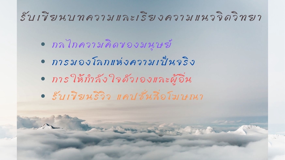 รับเขียนบทความเกี่ยวกับด้านจิตวิทยา บอกเล่าเรื่องราวปัญหาของชีวิต โลกของความเป็นจริงและการดำรงอยู่ของมนุษย์ รวมถึงการให้กำลังใจและการหาเพื่อนจับจูงมือผ่านข้ามอุปสรรคกันไปด้วยกัน ขั้นตอนการทำงาน 1. พูดคุยสอบถามรายละเอียดของงานจากความต้องการของลูกค้า 2. ตกลงเรื่องราคาการว่าจ้างงาน กำหนดวันและเวลาส่งไฟล์งาน (กรณีเร่งงานก่อนกำหนดคิดค่าใช้จ่ายเพิ่ม) 3. จะเริ่มดำเนินการหลังจากลูกค้าชำระโอนเงินเข้าระบบ 4. จะส่งเป็นไฟล์DOC ให้ลูกค้าตรวจสอบและสามารถแก้งานได้ไม่เกิน 3 ครั้ง แต่ถ้ามีให้ใส่รายละเอียดเพิ่มเติมจากที่บรีฟงานกันไว้ ครั้งที่ 2 เป็นต้นไป จะมีคิดค่าใช้จ่ายในการแก้ไขงาน ครั้งละ 80 บาท 5. ส่งไฟล์งานเป็นDOC หรือเป็นไฟล์PDF แล้วแต่ความสะดวกของลูกค้า