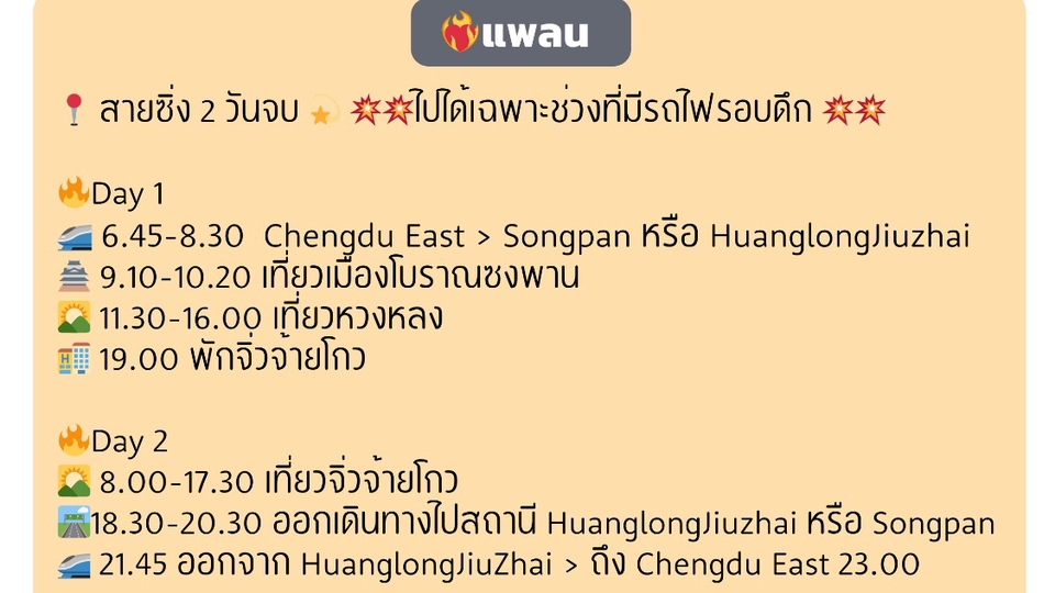 ฿12,100*ราคาแตกต่างกันตามจำนวนผู้เดินทาง มีราคาพิเศษสำหรับเด็กและผู้สูงอายุ* ราคารวม: ตั๋วอุทยาน รถเหมา โรงแรม รถไฟSecond class 📍 Day 1: 06:45 : ออกเดินทาง 09:10 - 10:20 : เที่ยวเมืองโบราณซงพาน 11:30 - 16:00 : เที่ยวหวงหลง 19:00 : เข้าพักโรงแรมที่จิ่วจ้ายโกว 📍 Day 2: 08:00 - 17:30 : เที่ยวที่จิ่วจ้ายโกว 18:30 - 20:30 : ออกเดินทางไปยังสถานี Huanglongjiuzhai หรือ Songppan 23:00 : ถึง Chengdu East