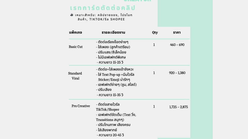 เรารับคิดคอนเทนต์+ตัดต่อ / 1 คลิป เหมาะสำหรับ: คลิปขายของ, โปรโมท สินค้า, TIKTOK/รีล SHOPEE สิ่งที่ลูกค้าจะได้ รายการ ดังนี้ 1. คิดคอนเทนต์ตามแบรนด์ที่Brief 2. ตัดต่อคลิปไวรัล + เอฟเฟกต์ 3. ใส่เสียงประกอบ / เพลง / มีม 4. Voice Over พากย์เสียง 5. ฟรีแก้ไข 1 รอบ