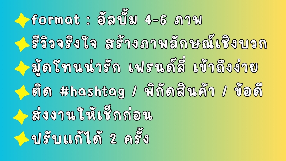 ฿1,800- โพสต์ Album 4 - 7 ภาพ คมชัด สวยงาม ( ลง Lemon8 เท่านั้น ) - Caption ความยาวตามเหมาะสม - รีวิวอย่างจริงใจ น่ารัก ชี้ให้เห็นจุดเด่นของสถานที่ บรรยากาศ กระตุ้นให้คนอยากไปตาม - ติด #Hashtag ที่แพลตฟอร์มกำลังดัน เพื่อเพิ่มยอดการมองเห็น - ส่ง Link ให้ลูกค้า หลังจากจบงาน +++ แถม ! นำภาพที่ถ่ายไป Review 5 ดาวบน Google Map ให้ฟรี 1 ครั้ง จาก Local Guide ระดับ 6 >> เพิ่มความน่าเชื่อถือ คนเห็นเยอะ ** หากสถานที่อยู่นอก กทม. จะขอบวกค่าเดินทางตามจริงเพิ่มด้วยนะคะ ** ยังไม่รวมค่าอาหาร หรือค่าซื้อบริการ