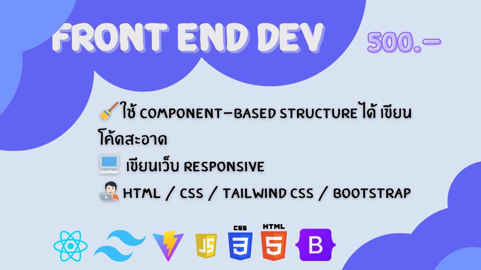 ฿3,500งาน HTML,CSS,JS,Tailwind,React,bootstrap Responsive ได้ทุกขนาดจอ - โค้คแก้ไขง่ายมีคอมเม้นว่าส่วนที่ทำอะไร - แยกโค้คเป็นส่วนๆชัดเจน หาง่าย - งานละเอียด - Animation & effects เล็กน้อย