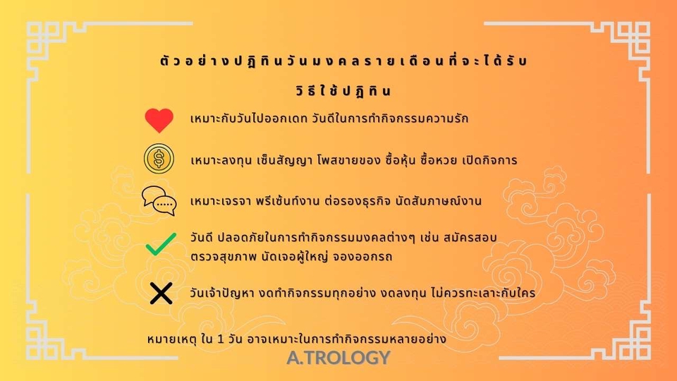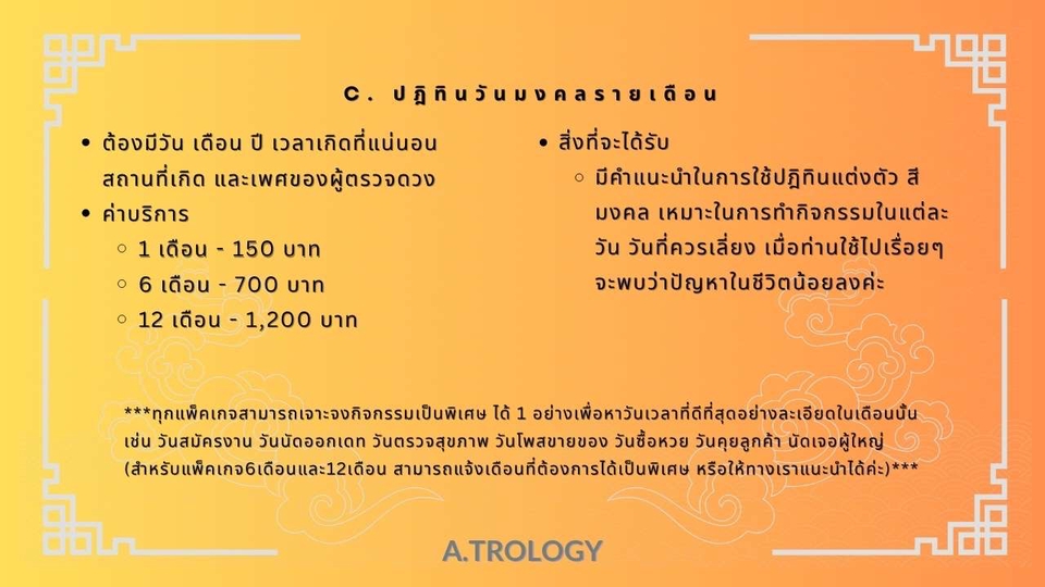 ฿1,200ตารางวันรายเดือน วันเวลาที่ดีที่สุดอย่างละเอียดในเดือนนั้น เช่น วันสมัครงาน วันนัดออกเดท วันตรวจสุขภาพ วันโพสขายของ วันซื้อหวย วันคุยลูกค้า นัดเจอผู้ใหญ่ [ต้องมีว/ด/ป/เวลาเกิด เพศ สถานที่เกิดแน่นอน]