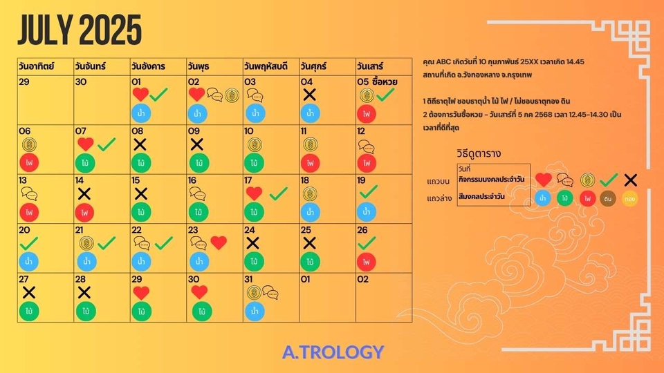 ฿700ตารางวันรายเดือน วันเวลาที่ดีที่สุดอย่างละเอียดในเดือนนั้น เช่น วันสมัครงาน วันนัดออกเดท วันตรวจสุขภาพ วันโพสขายของ วันซื้อหวย วันคุยลูกค้า นัดเจอผู้ใหญ่ [ต้องมีว/ด/ป/เวลาเกิด เพศ สถานที่เกิดแน่นอน]