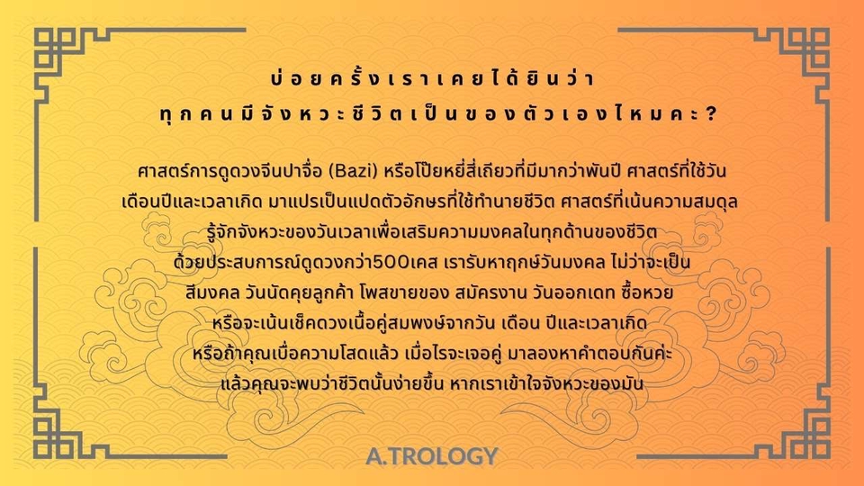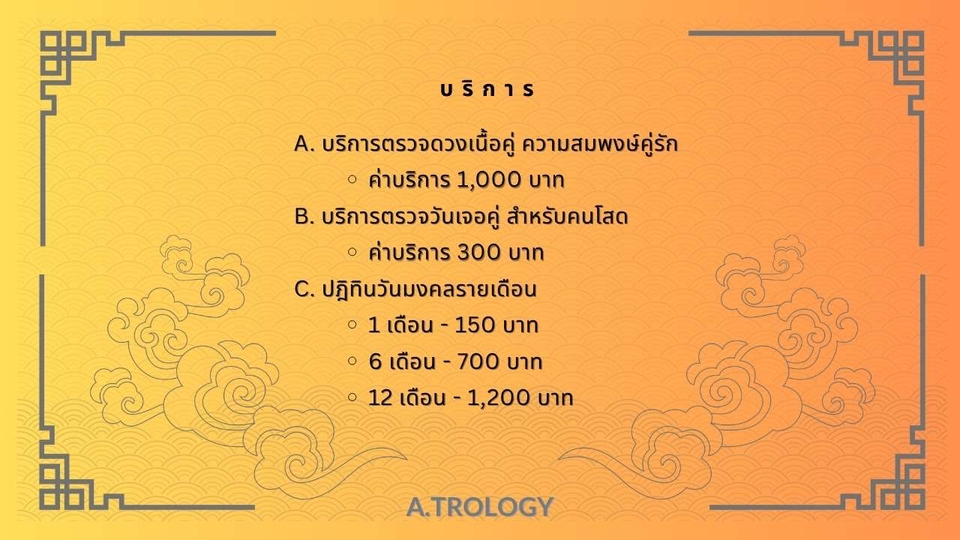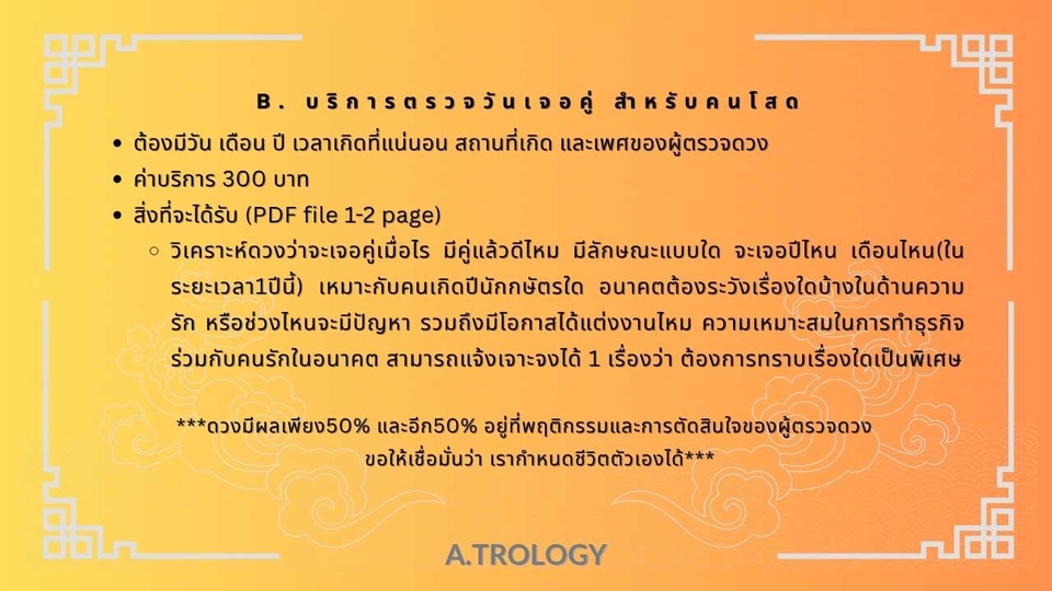 🌌บ่อยครั้งเราเคยได้ยินว่า ทุกคนมีจังหวะชีวิตเป็นของตัวเองไหมคะ? ศาสตร์การดูดวงจีนปาจื่อ (Bazi) หรือโป๊ยหยี่สี่เถียวที่มีมากว่าพันปี ศาสตร์ที่ใช้วันเดือนปีและเวลาเกิด มาแปรเป็นแปดตัวอักษรที่ใช้ทำนายชีวิต ศาสตร์ที่เน้นความสมดุล รู้จักจังหวะของวันเวลาเพื่อเสริมความมงคลในทุกด้านของชีวิต ด้วยประสบการณ์ดูดวงกว่า500เคส เรารับหาฤกษ์วันมงคล ไม่ว่าจะเป็น สีมงคล วันนัดคุยลูกค้า โพสขายของ สมัครงาน วันออกเดท ซื้อหวย หรือจะเน้นเช็คดวงเนื้อคู่สมพงษ์จากวัน เดือน ปีและเวลาเกิด หรือถ้าคุณเบื่อความโสดแล้ว เมื่อไรจะเจอคู่ มาลองหาคำตอบกันค่ะ แล้วคุณจะพบว่าชีวิตนั้นง่ายขึ้น หากเราเข้าใจจังหวะของมัน😊 บริการ ❤️A. บริการตรวจดวงเนื้อคู่ ความสมพงษ์คู่รัก ค่าบริการ 1,000 บาท ✔️ตรวจได้ทุกเพศ (ช-ญ/ช-ช/ญ-ญ) สามารถดูได้ทั้งหมด ✔️หากเลือกไม่ได้ว่าจะคบคนไหน เพิ่มดวงละ 500 บาท ✔️สิ่งที่จะได้รับ (PDF file 1-2 page) ✔️วิเคราะห์ดวงของทั้งสองคนว่า จะคบกันได้ระยะยาวไหม? หากคบกันจะส่งเสริมกันในด้านใด อนาคตต้องระวังเรื่องใดบ้าง หรือช่วงไหนจะมีปัญหา รวมถึงมีโอกาสได้แต่งงานไหม ควรแต่งปีไหน รวมถึงความเหมาะสมในการทำธุรกิจร่วมกัน ✔️สามารถแจ้งเจาะจงได้ 1 เรื่องว่า ต้องการทราบเรื่องใดเป็นพิเศษ (ไม่รวมถามฤกษ์แต่งงาน) ***ดวงมีผลเพียง50% และอีก50% อยู่ที่พฤติกรรมและการตัดสินใจของทั้งสองฝ่าย หากมีความตั้งใจจะรักกัน ขอให้ทั้งสองท่านมีความอดทน เข้าใจ และให้อภัยกัน จับมือกันผ่านทุกปัญหาไปด้วยกัน*** ❤️B. บริการตรวจวันเจอคู่ สำหรับคนโสด ค่าบริการ 300 บาท ✔️สิ่งที่จะได้รับ (PDF file 1-2 page) ✔️วิเคราะห์ดวงว่าจะเจอคู่เมื่อไร มีคู่แล้วดีไหม มีลักษณะแบบใด จะเจอปีไหน เดือนไหน(ในระยะเวลา1ปีนี้) เหมาะกับคนเกิดปีนักกษัตรใด อนาคตต้องระวังเรื่องใดบ้างในด้านความรัก หรือช่วงไหนจะมีปัญหา รวมถึงมีโอกาสได้แต่งงานไหม ความเหมาะสมในการทำธุรกิจร่วมกับคนรักในอนาคต ✔️สามารถแจ้งเจาะจงได้ 1 เรื่องว่า ต้องการทราบเรื่องใดเป็นพิเศษ ***ดวงมีผลเพียง50% และอีก50% อยู่ที่พฤติกรรมและการตัดสินใจของผู้ตรวจดวง ขอให้เชื่อมั่นว่า เรากำหนดชีวิตตัวเองได้*** ❤️C. ปฎิทินวันมงคลรายเดือน 1 เดือน - 150 บาท 6 เดือน - 700 บาท 12 เดือน - 1,200 บาท ต้องมีวัน เดือน ปี เวลาเกิดที่แน่นอน สถานที่เกิด และเพศของผู้ตรวจดวง ค่าบริการ 1 เดือน - 150 บาท 6 เดือน - 700 บาท 12 เดือน - 1,200 บาท ✔️ทุกแพ็คเกจสามารถเจาะจงกิจกรรมเป็นพิเศษ ได้ 1 อย่างเพื่อหาวันเวลาที่ดีที่สุดอย่างละเอียดในเดือนนั้น เช่น วันสมัครงาน วันนัดออกเดท วันตรวจสุขภาพ วันโพสขายของ วันซื้อหวย วั