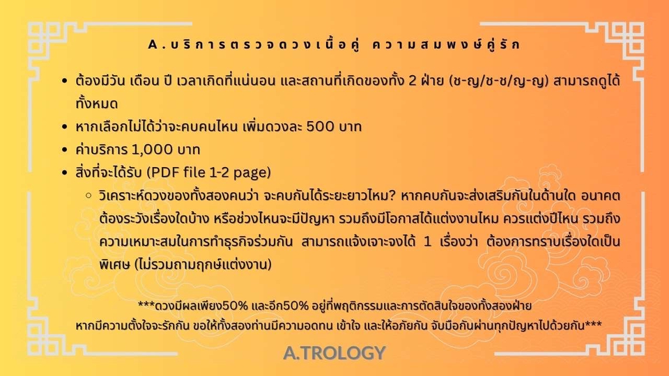 ฿1,000วิเคราะห์ดวงของทั้งสองคนว่า ระยะยาวหากคบกันจะส่งเสริมกันในด้านใด เรื่องควรระวัง ช่วงไหนมีปัญหาโอกาสได้แต่งงาน ความเหมาะสมในการทำธุรกิจร่วมกัน สามารถแจ้งได้ 1 เรื่องว่า ต้องการทราบเรื่องใดเป็นพิเศษ