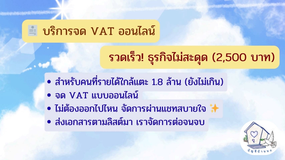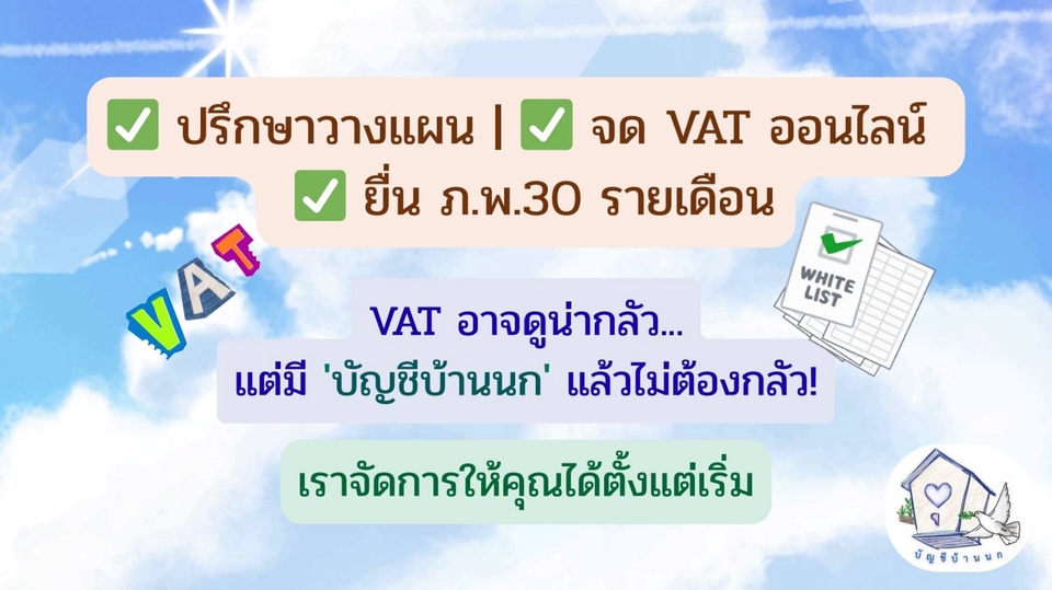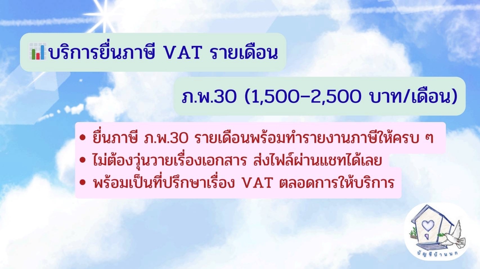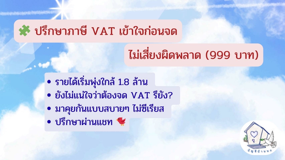 "VAT อาจดูน่ากลัว... แต่มี 'บัญชีบ้านนก' แล้วไม่ต้องกลัว!" เราจัดการให้คุณได้ตั้งแต่เริ่ม!" ✅ ปรึกษาภาษีVAT วางแผน | ✅ จด VAT ออนไลน์ | ✅ ยื่น ภ.พ.30 รายเดือน แพ็คเกจที่ 1: ปรึกษาภาษี VAT เข้าใจก่อนจด ไม่เสี่ยงผิดพลาด เหมาะกับบุคคลธรรมดา/บริษัท/เจ้าของกิจการที่รายได้ใกล้ 1.8 ล้านบาท/ปี แต่ยังไม่แน่ใจว่าจะต้องจด VAT หรือไม่ ✅ บริการที่คุณจะได้รับ: - ปรึกษา 1:1 ผ่านแชท (ระยะเวลา 3 วัน) - ประเมินรายได้เบื้องต้นว่าเข้าเกณฑ์ต้องจด VAT หรือยัง - อธิบายข้อดีข้อเสียของการจด VAT และผลกระทบที่ควรรู้ - Roadmap เตรียมตัวจด VAT + เช็กลิสต์แบบเข้าใจง่าย 🎁 ลูกค้าที่ใช้แพ็กนี้และจ้างจด VAT ต่อ รับส่วนลดพิเศษ! เหลือเพียง 2,250 บาท (จาก 2,500 บาท) 💬 ราคา: 999 บาท 📌 ให้บริการผ่านแชทเท่านั้น สะดวก ไม่ต้องนัด แพ็กเกจ 2: "บริการจด VAT ออนไลน์ - รวดเร็ว! ธุรกิจไม่สะดุด" สำหรับเจ้าของธุรกิจ บุคคลธรรมดา หรือนิติบุคคล ที่ใกล้หรือถึงเกณฑ์ 1.8 ล้านบาท/ปี และต้องการจด VAT แบบครบ จบ แบบออนไลน์ ทำไมต้องเลือกแพ็กเกจนี้? ✅ สะดวก ไม่ต้องเดินทาง ไม่ต้องเสียเวลา คุณแค่เตรียมเอกสาร เราจัดการให้ทั้งหมด ✅ รวดเร็ว ทันใจ หมดปัญหากังวลเรื่องเอกสารตกหล่น หรือขั้นตอนยุ่งยาก ✅ ดูแลการกรอก และยื่นเอกสาร พร้อมตรวจสอบความถูกต้องให้คุณมั่นใจ ✅ ให้คุณพร้อมลุยธุรกิจต่อทันที เมื่อจด VAT สำเร็จ เรามีสรุปและแนวทางปฏิบัติหลังจดให้คุณต่อยอดธุรกิจได้อย่างราบรื่น สิ่งที่คุณจะได้รับ: - เราช่วยวิเคราะห์ว่าธุรกิจคุณสามารถจด VAT ออนไลน์ได้หรือไม่ และให้คำแนะนำที่เหมาะกับธุรกิจของคุณ - ตรวจสอบความพร้อมของเอกสาร: เราแนะนำลิสต์เอกสารที่จำเป็น และช่วยตรวจสอบความถูกต้องก่อนยื่น เพื่อให้การจดราบรื่นที่สุด - ดำเนินการยื่น ภ.พ.01 ออนไลน์: เราจะเป็นผู้กรอกแบบฟอร์มและยื่นคำขอจดทะเบียนภาษีมูลค่าเพิ่ม (ภ.พ.01) ผ่านระบบออนไลน์ของกรมสรรพากร ทั้งหมดให้คุณ - ติดตามสถานะจนสำเร็จ และแจ้งคุณทันทีที่ได้รับการอนุมัติ 💬 ราคาเริ่มต้น: 2,500 บาท (ราคาขึ้นอยู่กับความซับซ้อนของธุรกิจ เช่น กรณีต้องยื่นแบบฟอร์มอื่นเพิ่มเติมจากปกติ การใช้เวลาติดตามเอกสารที่ได้รับไม่ครบถ้วน) 📌 ให้บริการปรึกษา/สอบถามผ่านแชท LINE ตอบไว ตอบตรงประเด็น ไม่ต้องรอนาน ⚠️ เฉพาะธุรกิจที่สามารถจด VAT ออนไลน์ได้เท่านั้น ❌ ไม่รวมบริการถ่ายภาพสถานที่, นัดเซ็นเอกสาร, ไปสำนักงานเขต แพ็คเกจที่ 3: บริการยื่นภาษี VAT รายเดือน (ภ.พ.30) สำหรับธุรกิจที่จด VAT แล้ว และต้องการมืออาชีพดูแลการยื่นภาษีทุกเดือนอย่างแม่นยำและตรงเวลา ✅ บริการที่คุณจะได้รับ: - เป็นที่ปรึกษาตอบคำถามเรื่อง VAT ตลอดทุกเดือนระหว่างที่ให้บริกา