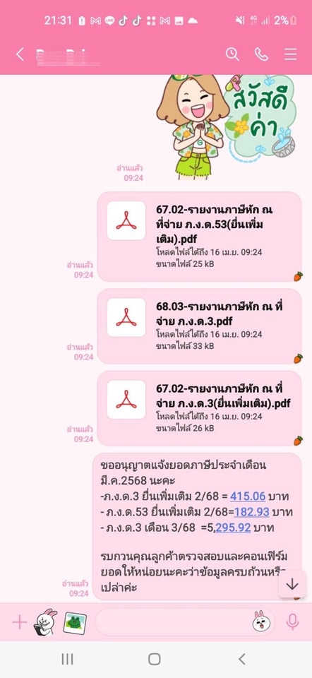 สวัสดีค่ะ 🙏🏻 ขอแนะนำตัวนิดนึงนะคะ เรียกว่าวรัท ก็ได้ค่ะ 📍มีประสบการณ์ทำงานสำนักงานบัญชีมากกว่า 3 ปีค่ะ และปัจจุบันก็ทำอยู่ค่ะ ✨ -รับจัดทำรายงานภาษีซื้อ ภาษีขาย -บันทึกบัญชีรายเดือน -ยื่นแบบภาษีหัก ณ ที่จ่าย ทุกแบบ (ภ.ง.ด.1,3,53) -ยื่นแบบภาษีมูลค่าเพิ่ม (ภ.พ.30 / ภ.ธ.40) -จัดทำและยื่นแบบประกันสังคม/กองทุนเงินทดแทน -ยื่น บอจ.5 และ งบการเงิน -แจ้งเข้า - ออก ประกันสังคม