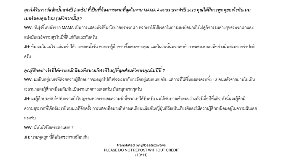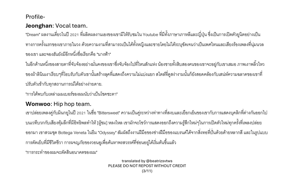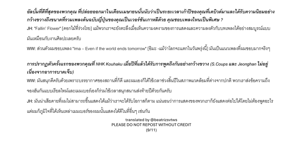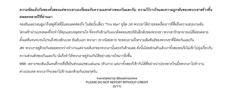 แปลบทสัมภาษณ์นิตยสาร MADAME FIGARO ของสองหนุ่มไอดอลเกาหลีชื่อดัง “จองฮัน x วอนอูแห่งวงเซเว่นทีน” จากภาษาอังกฤษเป็นภาษาไทยในฉบับภาษาที่เข้าใจง่ายที่สามารถสื่อสารให้เข้าใจได้มากยิ่งขึ้น ขั้นตอนการทำงาน 1. ลูกค้าสามารถติดต่อมาสอบถามรายละเอียดเกี่ยวกับการแปลและการจ้างงานได้ก่อนเริ่มตัดสิน 2. หากลูกค้ายินยอมใช้บริการทางเราขอให้ลูกค้าบรีฟหรืออธิบายงานที่ต้องการให้เราแปลอย่างละเอียดเพื่อป้องกันความผิดพลาดที่อาจเกิดขึ้น 3. หากลูกค้ามีรูปภาพหรือข้อความใดๆที่อยากให้เราเน้นและสื่อสารให้ชัดเจนกรุณาระบุมาให้อย่างชัดเจน 4. หากทางไม่เข้าใจในเนื้อหาหรือรายละเอียดบางส่วนทางเราขอสอบถามลูกค้าเพื่อป้องกันข้อมูลตกหล่น 5. หากมีการเรียบเรียงเสร็จครั้งแรกเราจะทำการส่ง draft เป็นไฟล์ pdf.ส่งให้ลูกค้าทำการตรวจทาน (ในกรณีนี้หากมีการแก้ไขขอให้ลูกค้าส่งกลับมาภายใน2วันหลังจากมีการส่ง draft ให้กับทางลูกค้าแล้ว) 6. หากมีการตรวจทานเรียบร้อยและทางลูกค้ามีการ confirm ว่าพอใจกับงานแล้วหากมีการขอแก้ไขภายหลังทางร้านขอคิดค่าบริการเพิ่มเติมเนื่องจากทางลูกค้ามีการ confirm ไปในก่อนหน้านี้แล้ว 7. หากลูกค้ามีการนำไฟล์ draft ไปเผยแพร่ก่อนที่ทางเราจะส่งงาน final ให้เราขอดำเนินโดยแจ้งไปยังทีมช่วยเหลือเพื่อแจ้งถึงพฤติกรรมของลูกค้าให้ทางทีมงานรับทราบและหากชิ้นงานมีมูลค่ามากกว่า 5,000 บาททางเราขอดำเนินการคดีตามกฎหมาย 8. ขอให้ลูกค้าอ่านรายละเอียดและขั้นตอนให้ชัดเจนหากมีข้อสงสัยเพิ่มเติมทางเรายินดีตอบทุกข้อสงสัยค่ะ