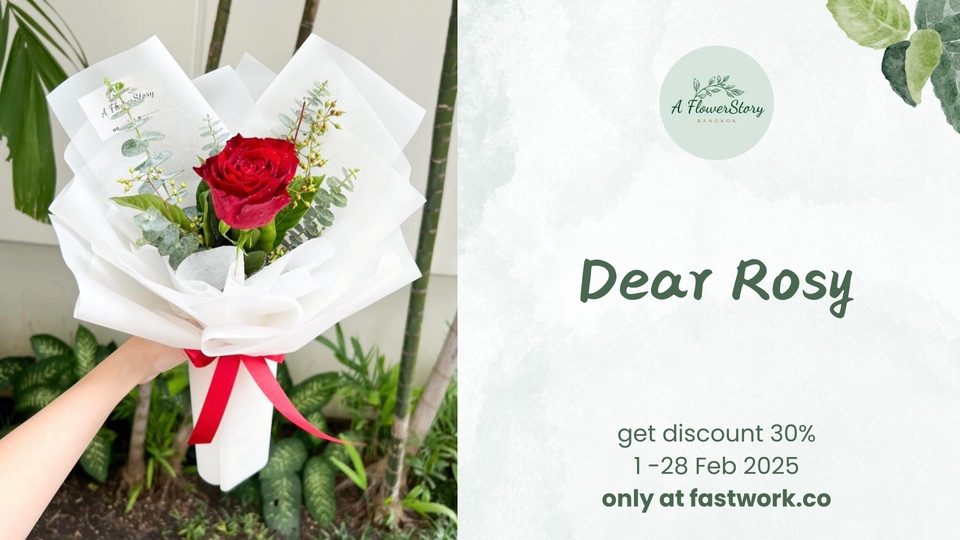 aflowerstory.bkk รับจัดดอกไม้แบบ custom made ที่ตามใจผู้ให้ถูกใจผู้รับ เรามีดอกไม้สดหลากสีสันและสายพันธุ์ โดยคุณสามารถเลือกได้หลากหลายรูปแบบ ไม่ว่าจะเป็น - ช่อดอกไม้แบบบูเก้ Bouquet - ดอกไม้สด 1 ดอกห่อด้วยกระดาษห่อของขวัญ - ตะกร้าดอกไม้ และอื่นๆ ทักแชทมาหาเราได้เลย พิเศษ! ตอนรับวาเลนไทน์ เฉพาะเดือนกุมภาพันธ์ สั่งซื้อดอกไม้ร้านเราผ่าน fastwork รับไปเลย ส่วนลด 30% ลดได้สูงสุด 1500 บาทต่อคำสั่งซื้อ ขั้นตอนการทำงาน 1. ทักแชทเพื่อคุยรายละเอียด สถานที่ วันและเวลา 2. คอนเฟิร์มวัน, เวลา, รายละเอียด 3. ลูกค้าชำระเงินเข้ามาที่ระบบ 4. เริ่มดำเนินการทำงานตามที่ตกลง