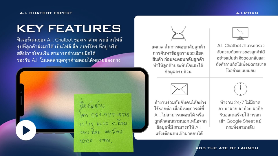 รับทำ A.I. Chatbot รองรับโมเดลล่าสุด ChatGPT, Gemini และ Claude สามารถเชื่อมต่อได้หลายช่องทาง ไม่ว่าจะเป็น Facebook, Instagram, Line, Telegram, Slack **มี Demo ให้ทดลองพูดคุยกับแชทบอท** เพิ่มช่องทางละ 2,500 บาท หรือเชื่อมต่อทุกช่องทางเพิ่ม 5,000 บาท ✅ เลือกใช้งานได้ทั้ง ChatGPT, Google Gemini, Anthropic Claude (ใช้งานผ่าน API) ✅ กรอกข้อมูล แก้ไขข้อมูลรายละเอียดสินค้าและบริการที่ต้องการได้ง่ายดายผ่าน Google Sheet ✅ มี Mobile App ทั้ง Android และ iOS ให้ใช้งาน ✅ สามารถเซ็ต Persona กำหนดสไตล์และโทนการตอบของบอทให้เป็นแบบแบรนด์ที่ต้องการได้ ✅ สามารถอ่านไฟล์รูปชื่อ ที่อยู่ เบอร์โทรได้ (ทั้งตัวพิมพ์และลายมือ) ✅ สามารถอ่านไฟล์สลิปโอนเงินได้ (ทั้งตัวพิมพ์และลายมือ) ✅ สามารถตอบกลับลูกค้าได้แทบทุกภาษา (80 ภาษา) ✅ ทำงานผ่านระบบ Cloud ไม่ต้องติดตั้ง ไม่ต้องเขียนโปรแกรม ส่งมอบแล้วใช้งานได้เลย หมายเหตุ: มีค่าโปรแกรมตั้งค่า A.I. Chatbot เริ่มต้นเดือนละ 500 กว่าบาท ผู้รับงานมีประสบการณ์ทำงานด้าน IT มากกว่า 20 ปี และประสบการณ์ด้าน E-commerce 10 ปี เป็นที่ปรึกษาและให้ความรู้ด้านการตลาดออนไลน์มากกว่า 8 ปี ปัจจุบันพัฒนา A.I. Chatbot สำหรับ E-commerce และใช้งานจริงแล้วรองรับทุกช่องทาง สามารถอ่านไฟล์รูปและลายมือได้ สามารถปรึกษาและขอดู Demo ได้ ขั้นตอนการทำงาน 1. พูดคุยรายละเอียดของงาน ขอบเขตของโปรเจ็ค 2. ลูกค้ากรอกรายละเอียดสินค้าและบริการใน Google Sheet 3. ส่งตัวดราฟให้ทางลูกค้าทดลองใช้งาน 4. แก้ไขได้อีก 3 ครั้งก่อนส่งมอบงาน 5. ส่งมอบงาน