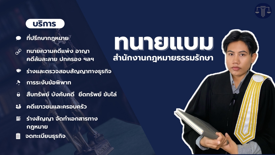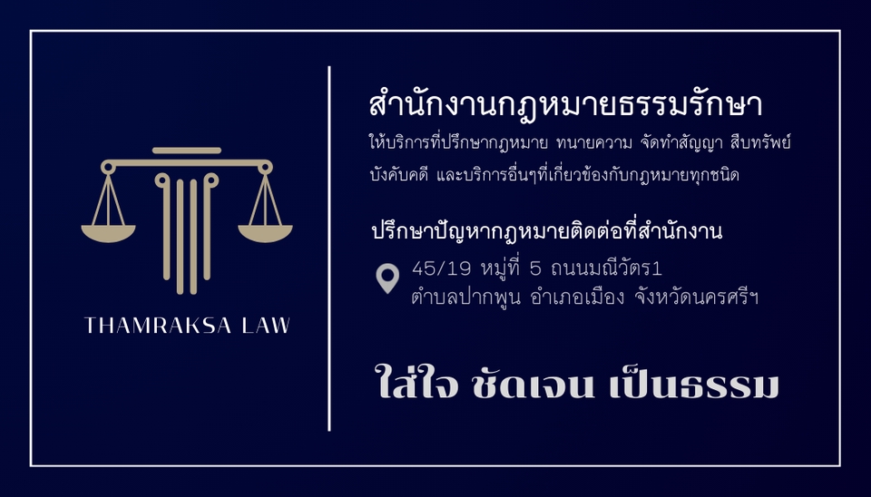 ให้บริการด้านกฎหมายด้วยความรู้ที่ทันสมัย ถูกต้อง และแม่นยำ เคยมีประสบการณ์ทั้งงานที่ปรึกษาและงานคดีความ เน้นการทำงานที่ "รวดเร็ว" และ "รักษาผลประโยชน์ของลูกความ" เป็นสำคัญ 1.รับปรึกษาด้านกฎหมายเบื้องต้น และให้ความเห็นทางกฎหมาย 2.รับว่าความอรรถคดี ว่าความในชั้นศาล หากมีความประสงค์ต้องการ ใช้สิทธิทางศาล เช่น - คดีไม่มีข้อพิพาท เช่น ตั้งผู้จัดการมรดก ตั้งผู้อนุบาล จดชื่อบริษัทคืนสู่ทะเบียน ฯลฯ - คดีมีข้อพิพาท เช่น คดีกู้ยืมเงิน บัตรเครดิต ละเมิด ฟ้องหย่า ผิดสัญญาต่างๆ อาญาเช็ค คดีผู้บริโภค คดีปกครอง คดีแรงงาน(เลิกจ้างไม่เป็นธรรม ค่าชดเชย ฯลฯ)คดีแพ่ง-อาญา ฯลฯ - ชั้นต้น อุทธรณ์ ฎีกา - ทนายสามารถยื่นฟ้องออนไลน์ผ่านระบบ E-filing หรือ ติดตามคดีผ่านระบบ CIOS ได้ครับ 3. บังคับคดี เช่น ตั้งเจ้าพนักงานบังคับคดี แจ้งยึด-อายัด ขายทอดตลาด สืบทรัพย์ ฯลฯ 4. เอกสารทางกฎหมาย เช่น ออกหนังสือทวงถาม (โนติส) ร่างสัญญา ตรวจสัญญา (ภาษาไทยและภาษาอังกฤษ) อุทธรณ์คำสั่งทางปกครอง คำให้การ ฯลฯ *หมายเหตุ สามารถพูดคุยแก้ไขงานได้ หากเป็นเรื่องคดีความ ลูกความจำเป็นต้องแจ้งข้อเท็จจริงโดยละเอียดทั้งหมด จะได้วางรูปคดีได้อย่างเหมาะสมและถูกต้อง รายละเอียดราคา : ราคาขึ้นอยู่กับความยาก-ง่าย ความซับซ้อน ปริมาณเอกสาร เนื้อหาคดี โดยจะประเมินราคาให้ลูกค้าทราบก่อนเพื่อตัดสินใจ ( ราคาไม่รวม ค่าธรรมเนียมศาล และค่าเดินทางกรณีออกนอกเขตกรุงเทพและอำเภอเมืองจังหวัดนครศรี ฯ) ขั้นตอนการทำงาน 1. สอบถามและปรึกษากฎหมายเบื้องต้นฟรี ทิ้งข้อความโดยแจ้งรายละเอียดข้อเท็จจริงที่จะปรึกษาไว้ได้เลย โดยทนายจะติดต่อกลับ และประเมินค่าใช้จ่ายให้พิจารณาผ่านช่องทางแชท) 2. ทนายจะแจ้งขอบเขตการทำงาน ระยะเวลาส่งมอบงาน 3. เมื่อลูกค้าชำระเงิน ทนายถึงจะดำเนินงาน ทนายจะรายงานความคืบหน้า(ทางแชท ทางไลน์หรืออีเมลตามความสะดวกของลูกความ) และส่งมอบงานตามระยะเวลาที่ตกลงกัน ลูกความสามารถทักสอบถามหรือติดตามงานได้ตลอด