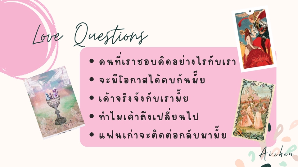 รับเปิดไพ่ทาโร่ต์เพื่อเสริมความมั่นใจ แนะนำ ช่วยในการตัดสินใจเรื่องต่างๆ ให้คำปรึกษาและช่วยผ่อนคลายจิตใจจากปัญหาต่างๆ ด้วยไพ่พลังงานดีๆ ถาม/ตอบด้วยการส่งแชท และพิมพ์กลับ ไม่จำเป็นต้องเห็นหน้าหรือทราบชื่อจริง หากต้องการโทร กรุณานัดหมายก่อนล่วงหน้า ขั้นตอนการทำงาน 1. เลือกแพคเกจที่ต้องการ 2. ส่งคำถามที่ต้องการทราบ หรือนัดหมายเวลาผ่าน Line หรือ FB Messenger 3. หลังจากชำระเงิน ลูกค้าแจ้งชื่อจริง ชื่อเล่น หรือนามแฝงได้ตามสะดวก และอายุ 4. เริ่มดูไพ่ ส่งคำตอบ 5. จบงาน และรีวิว