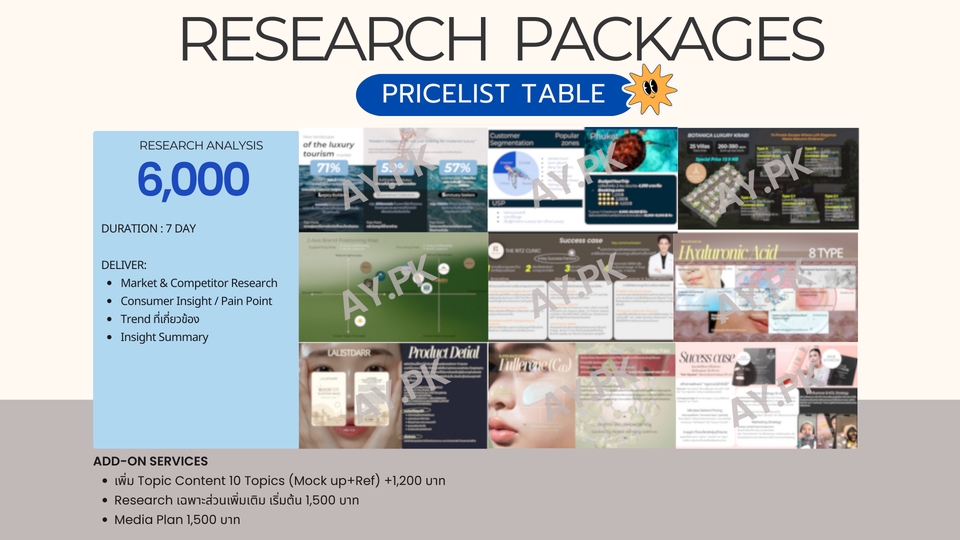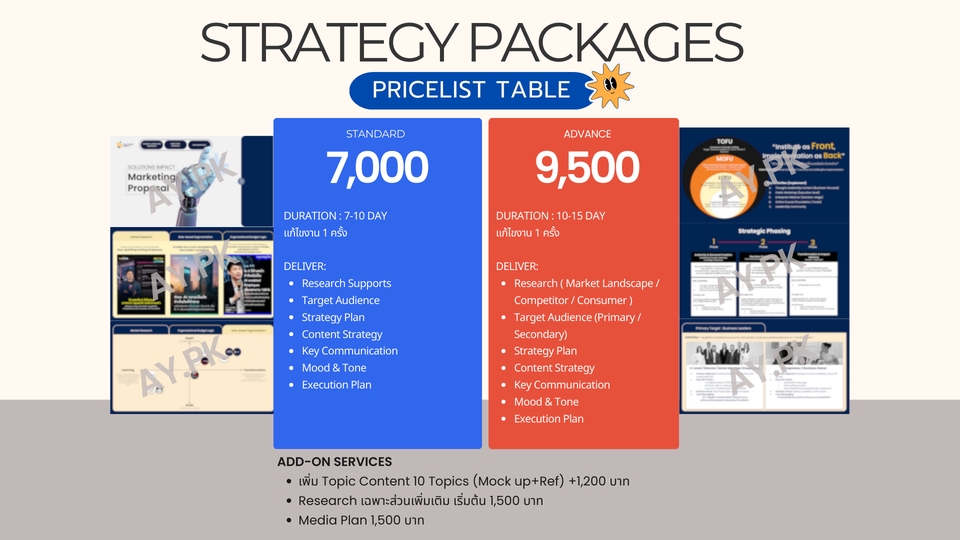 ฿7,000Deliver: - Research Supports - Target Audience - Strategy Plan - Content Strategy - Key Communication - Mood & Tone - Execution Plan - พร้อมตกแต่งสไลด์