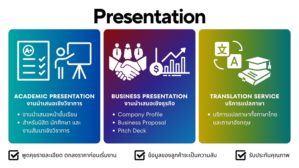 รับทำ Presentation โดยใช้ Google Slides หรือ Canva ระดับธุรกิจ และระดับนักศึกษา - สามารถทำได้ทั้งแนววิชาการ และแบบธุรกิจ เน้นเข้าใจง่ายผ่านการออกแบบ Infographic - รับทำทั้ง ภาษาอังกฤษ และ ภาษาไทย - ราคาเริ่มต้นอยู่ที่ 120 บาท/สไลด์ ราคาอาจจะเพิ่มหรือลดขึ้นอยู่กับจำนวนและความต้องการเพิ่มเติม - บริการแปลภาษา บวกเพิ่มที่ 100 บาท/สไลด์ - บริการสรุปข้อมูล เริ่มต้นที่ 500 บาท ขึ้นอยู่กับจำนวนข้อมูล Bio - มีประสบการณ์ทำ Presentation วิชาการ ระดับ International Conference ที่ Australia - ทักษะภาษาอังกฤษระดับ fluent - มีงานประจำ ตำแหน่งเกี่ยวกับ Business, Raise-funding, Marketing, Product, Tech - จบการศึกษาที่คณะวิศวกรรมศาสตร์ จุฬาฯ ภาคนานาชาติ มีความรู้ด้านวิศวกรรม - มี Certificate Google Data Analytics สามารถออกแบบสไลด์โดย Data Visualization ได้ - ประสบการณ์จัดทำเนื้อหาและออกแบบ Presentation และ Infographic มากกว่า 5 ปี ขั้นตอนการทำงาน 1. พูดคุยรายละเอียดและขอบเขตของงาน รูปแบบของการนำเสนอ พร้อมระยะเวลาส่งงาน 2. ประเมินจำนวนเนื้อหาที่ลูกค้าต้องการ 3. ตกลงรายละเอียดโทนสี ฟอนต์ การจัดวาง รูปแบบของตกแต่ง 4. ประเมินราคา 5. ทำงานและแก้ไขงานตามข้อตกลง 6. ส่งงานให้ตรวจสอบความถูกต้องตามกำหนดการ (สามารถแก้ไขได้ตามที่ตกลงไว้)