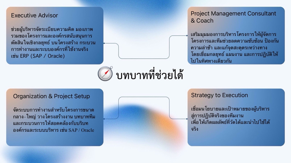 ให้คำปรึกษาเชิงกลยุทธ์สำหรับผู้บริหาร ด้วยประสบการณ์กว่า 30 ปี ในการบริหารโครงการ และจัดระบบงาน ช่วยมองภาพรวม ตัดสินใจอย่างเป็นระบบ และเชื่อมกลยุทธ์สู่การปฏิบัติจริง มีประสบการณ์ตรงกับ ERP (SAP / Oracle) เข้าใจทั้งมุมบริหารและหน้างาน สามารถให้คำปรึกษาได้ทั้งแบบ Online และ Onsite พื้นที่ทำงาน: สีลม / สามย่าน / สยาม (รวมค่าเดินทางในพื้นที่ดังกล่าว) เหมาะสำหรับองค์กรที่ต้องการที่ปรึกษาคู่คิด เพื่อจัดการความซับซ้อนของโครงการและการตัดสินใจระดับผู้บริหาร คิดค่าบริการ 2000 บาท/ชั่วโมง