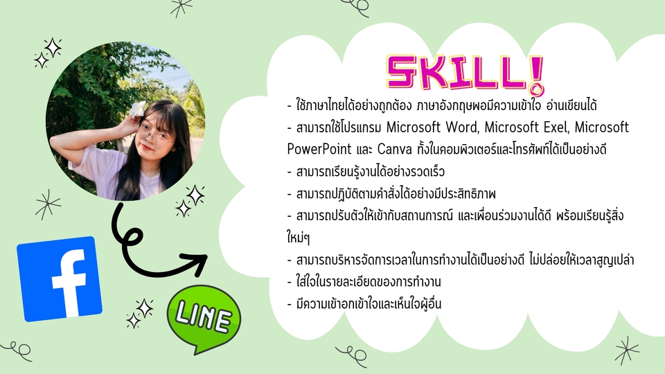 ประสบการณ์ทำงาน เจ้าหน้าที่บันทึกข้อมูล(หน่วยงานราชการ) 2 ปี - เป็นแอดมินเพจ ตอบแชท รร.สอนดนตรี ทักษะ - สามารถใช้โปรแกรม Microsoft Word, Exel, PowerPoint ได้เป็นอย่างดี - สามารถใช้โปรแกรม Canva ได้เป็นอย่างดี - สามารถออกแบบ presentation , แผ่นพับ , ใบปลิว - ตัดคลิปสั้นๆลง TikTok ได้ -ใช้ภาษาไทยได้ถูกต้องชัดเจน คะ/ค่ะ