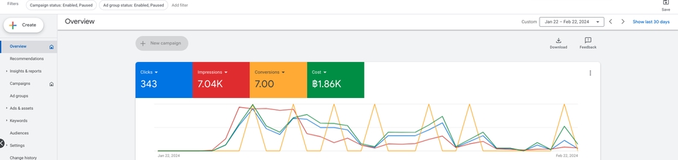 ฿30,000ระยะเวลาดูแล 3 เดือน โดยงบประมาณโฆษณาตามความเหมาะสม แนะนำงบเริ่มต้น 5,000 บาท Search Campaign Display Campaign Demand Gen campaign Performance Max Campaign