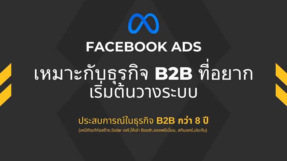฿30,000แพ็กเกจนี้เหมาะสำหรับธุรกิจ B2B ที่ต้องการทดสอบตลาด สร้าง Lead คุณภาพ และวางโครงสร้างการทำโฆษณาอย่างเป็นระบบ เพื่อการขยายผลในระยะยาว *งบโฆษณา ไม่เกิน 20,000 บาท / เดือน **ไม่รวมค่าโฆษณาในค่าบริการ