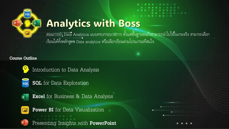 สอนทำ Data analytics ตั้งแต่พื้นฐานจนถึงสามารถนำไปใช้ในงานจริง (SQL, Excel, Power BI, PowerPoint)
