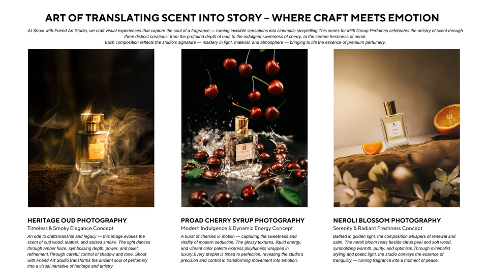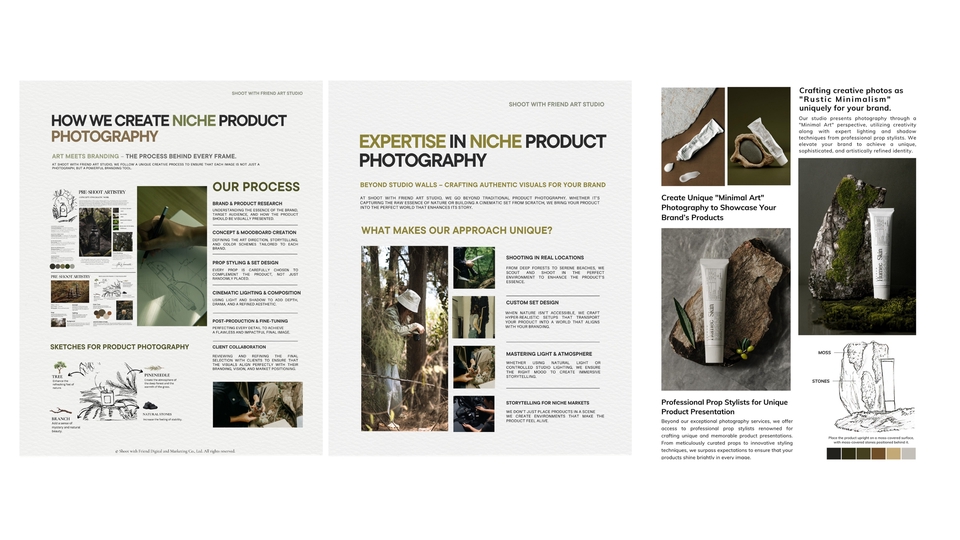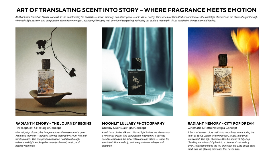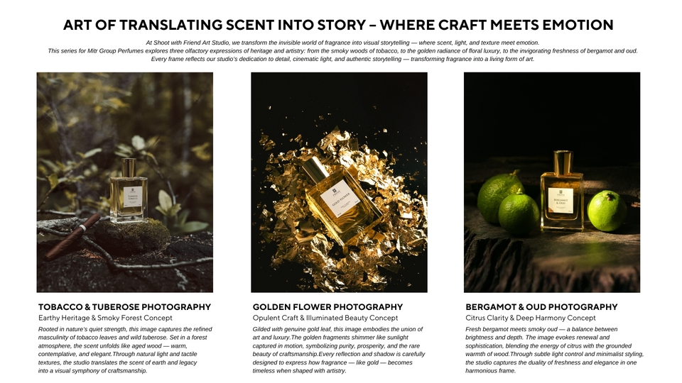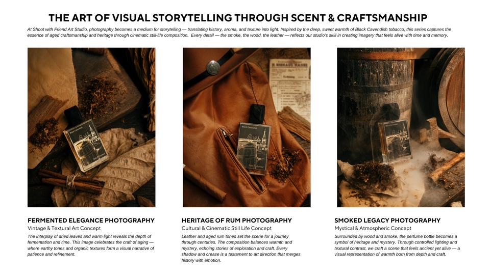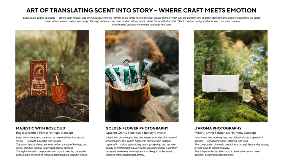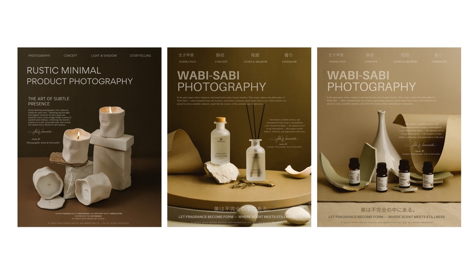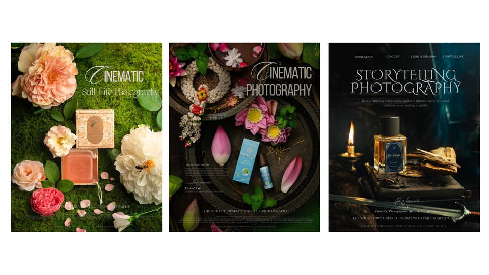 เพราะภาพที่ใช่… ไม่ได้แค่สวย แต่ทำให้ ลูกค้ารู้สึกถึงแบรนด์คุณตั้งแต่แรกเห็น ห้ภาพเล่าเรื่องแทนแบรนด์คุณ มาสร้าง “Brand Storytelling” กับอาร์ตสตูดิโอเล็กๆแต่ทุกโปรเจกต์ คือการเดินทาง ที่เราทำงาน เคียงข้าง กับเพื่อนๆในทุกขั้นตอน ทุกภาพถ่ายคือการเล่าเรื่องราวของแบรนด์ที่เราออกแบบมาเฉพาะคุณเท่านั้น 🍃 ทุกงานคือการสร้างสรรค์แบบพิเศษ "สร้างเรื่องราวตามสตอรี่ของเเบรนด์ โดยใช้ความชอบของลูกค้าพัฒนากับความคิดสร้างสรรค์" เรามุ่งมั่นสร้างงานที่มีเอกลักษณ์เฉพาะตัว ที่นี่ไม่ใช่แค่การถ่ายภาพ แต่คือการเล่าเรื่องราวที่สะท้อนตัวตนของแบรนด์คุณผ่านมุมมองที่แตกต่างและยูนีคไม่ซ้ำใคร เปลี่ยนภาพสินค้าของคุณให้เป็นงานศิลป์ที่เล่าเรื่องราวของแบรนด์ได้อย่างมีเอกลักษณ์โดย Shoot with Friend Art Studio — สตูดิโอที่เชี่ยวชาญด้าน Art Direction และ Conceptual Storytelling สำหรับแบรนด์พรีเมียมและสินค้า niche รายละเอียดบริการ ✨ สร้างภาพถ่ายที่ สะท้อนบุคลิกของแบรนด์ (Brand Personality)ผ่านการจัดองค์ประกอบ แสง เงา และพร็อพที่ออกแบบเฉพาะสำหรับสินค้าแต่ละชิ้น ✨ ทุกโปรเจกต์คือการร่วมออกแบบอย่างมี Conceptual Storytellingช่วยวิเคราะห์จุดเด่นของสินค้า วางแนวทาง Mood & Toneและสร้าง “ภาพถ่ายที่ขายอารมณ์ได้” มากกว่าการขายสินค้า ✨ ผลงานทุกชิ้นถูกสร้างสรรค์ด้วยความใส่ใจในรายละเอียดทุกองค์ประกอบถูกวางเพื่อให้ภาพของคุณ “มีเรื่องราว” และ “ความหมาย” ✨ สร้างบรรยากาศในภาพ ป่า เขา ทะเล ฉากแฟนซี ที่เชื่อมโยงกับอารมณ์ของแบรนด์ โดยใช้ฉากจากป่าเเละธรรมชาติจริง สไตล์งาน (Signature Styles) • Cinematic Still Life • Rustic Minimal • Storytelling Photography • Artistic Prop Styling & Environment Design • Cross-Cultural & Symbolic Storytelling • Mystical / Botanical / Craft-Inspired Imagery เหมาะสำหรับแบรนด์ที่ต้องการ… • ภาพสินค้าที่มีความหมายมากกว่าความสวยงาม • Mood & Tone เฉพาะตัว ที่สื่อถึงคุณค่าและแนวคิดของแบรนด์โดยเฉพาะเเบรนด์ nich หรือ พรีเมี่ยม • ภาพถ่ายที่มีเรื่องเล่า ได้แรงบันดาลใจจาก ธรรมชาติ ประวัติศาสตร์ เทพนิยาย และแฟนตาซี • ภาพที่พร้อมใช้งานทั้งในเว็บไซต์ แคตตาล็อก หรือโฆษณา สิ่งที่คุณจะได้รับ • Pre-shoot briefing ให้เห็นแนวทางก่อนถ่ายจริง • ประชุมออนไลน์ พูดคุยและปรับแนวได้ • ภาพทุกภาพ Custom-made — ไม่มีเทมเพลต ไม่มีซ้ำ • การดูแล Mood & Tone และองค์ประกอบภาพให้เหมาะกับแบรนด์ที่สุด • ใส่ใจทุกรายละเอียด ตั้งแต่เลือกพร็อพ ฉากป่าธรรมชาติ ไปจนถึงการส่งงานขั้นสุดท้าย • ภาพถ่ายคุณภาพสูง (JPG 300 dpi) พร้อมใช้งาน • รีทัชแสง สี และรายละเอียดครบ • บริการส่งสินค้าคืนฟรีทั่วประเทศ • คำแนะนำการนำภาพไปใช้ใน Website / Social / Ads 🔧 ขั้นตอนการทำงาน (Workflow) 1. ลูกค้าส่งรายละเอียดคอนเซปต์ / แนวทางภาพให้ชั