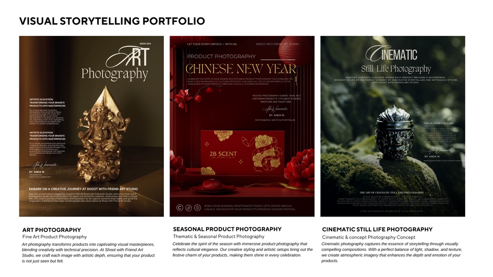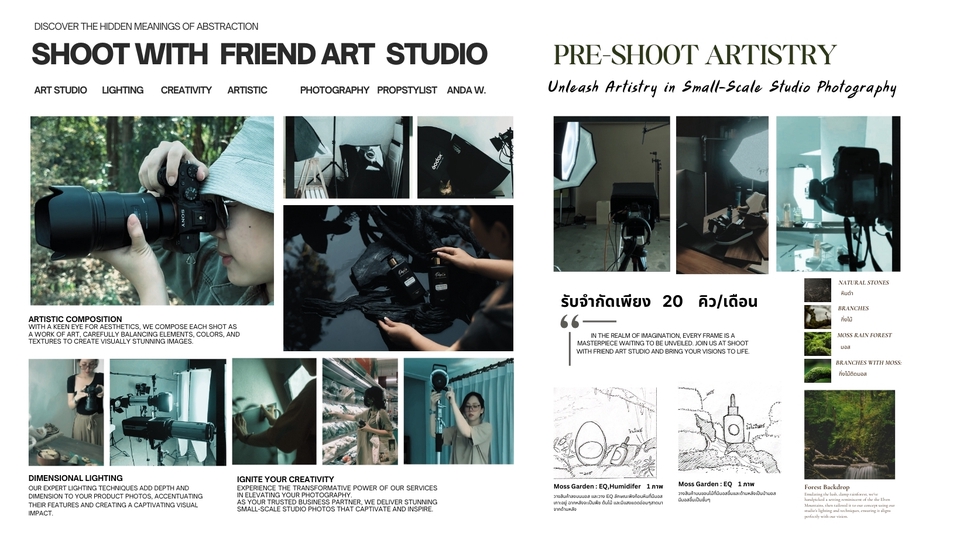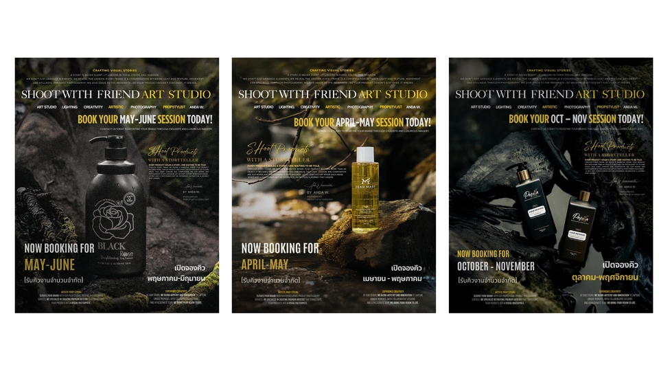 อันดา — ช่างภาพและสไตลิสต์พร็อพ ผู้ก่อตั้ง Shoot with Friend Art Studio สตูดิโอถ่ายภาพเชิงศิลป์ที่เชี่ยวชาญด้าน story-driven product photography สำหรับ premium and niche brands ทั้งในไทย ญี่ปุ่น และต่างประเทศ โดดเด่นด้วย visual storytelling ที่ถ่ายทอดตัวตนและอารมณ์ของแบรนด์ ยินดีให้บริการค่ะ