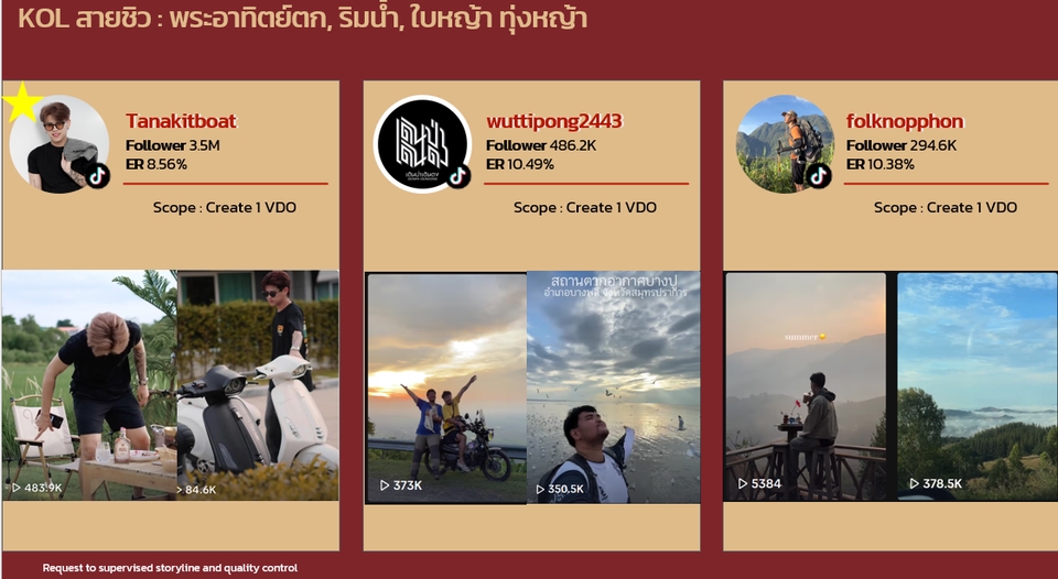 ให้บริการทำ Influencer Marketing Plan แบบครบวงจร ตั้งแต่การสรรหา influencer ตามโจทย์สินค้าของลูกค้า และตรงตาม Target ติดต่อประสานงาน ทำสัญญา ตกลงเงื่อนไข ระยะเวลาการทำงาน และวิเคราะห์ผลแคมเปญให้ ผ่านทุกช่องทางทั้ง Social Media และอื่นๆ Facebook/Instagram/Tiktok/Twitter/Youtube/Lemon8 เหมาะกับใคร ? - เจ้าของแบรนด์ที่ต้องการใช้ influencer แบบ effective และ quality content - SME/เจ้าของแบรนด์/ผู้ประกอบการ ที่ต้องการเฟ้นหา influencer ที่เหมาะกับกลุ่มเป้าหมายของแคมเปญ ขั้นตอนการทำงานโดยคร่าว 1. รับบรีฟจากลูกค้าเพื่อนำมาวิเคราะห์ วางแผนทำการตลาด 2. นำเสนอ Proposal ให้ลูกค้า ทั้ง influencer lists - Target audience - content idea - scope of work - timeline - condition - budget (สามารถนัด conference call ได้) 3. หากลูกค้าตกลงตามการนำเสนอ จะเริ่มแคมเปญตามตกลง (สามารถปรับแก้ได้ 2 ครั้ง) 4. มีการส่ง content approve ก่อนโพสต์ 5. ทำผลวิเคราะห์ performance ของ content ให้ ** ยังไม่รวมค่าจ้าง influencers/การจัดส่งสินค้า/ค่าใช้จ่ายที่เกี่ยวข้องกับแคมเปญ ** ** เป็นค่าใช้จ่ายเฉพาะค่าบริการของ freelance ** ขั้นตอนการทำงาน 1. รับบรีฟจากลูกค้า ทำ proposal นำเสนอ ทั้ง influencer list/budget/timeline/condition/scope of work 2. ปรับแก้ได้ 2 ครั้ง หากไม่มีแก้ไขตกลงตามแผนการตลาดที่นำเสนอ เริ่มจัดทำสัญญาและเริ่มดำเนินการ 3. ลูกค้าตรวจ content idea และ mood & tone ของแต่ละ influencer พร้อมตรวจ script เพื่อเริ่มถ่าย content 4. ลูกค้าได้ตรวจสอบ content ก่อนลงงานจริง 5. จัดทำการประเมินและวัดผล content ให้ตาม digital marketing metric