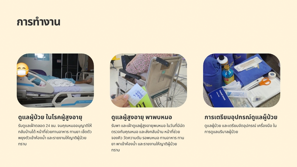 รับจ้างพาไปหาหมอ พอหมอ นัดตรวจสุขภาพที่คลินิก ที่โรงพยาบาล รับเฝ้าไข้ ดูแลผู้ป่วย ผู้สูงอายุ รายวัน รายชั่วโมง ที่บ้าน ที่โรงพยาบาล รับพาผู้สูงอายุ ผู้ป่วย พาไปทำธุระ เที่ยว ทำบุญ และอื่นๆ มีรถยนต์บริการรับ-ส่ง (ค่าบริการ ไม่รวมค่ารถไป - กลับ) พื้นที่ให้บริการ - พื้นที่เชียงใหม่ ลำพูน เชียงราย ภาคเหนือ - เชียงใหม่ไป กทม. และพากลับเชียงใหม่ - อื่นๆ สอบถามได้ค่ะ ขั้นตอนการทำงาน 1. คุยรายละเอียดงานที่ลูกค้าต้องการจ้าง 2. ทำงานตามรายละเอียดที่ลูกค้าจ้าง 3. สอบถาม และประเมินความพึงพอใจในการใช้บริการของลูกค้า
