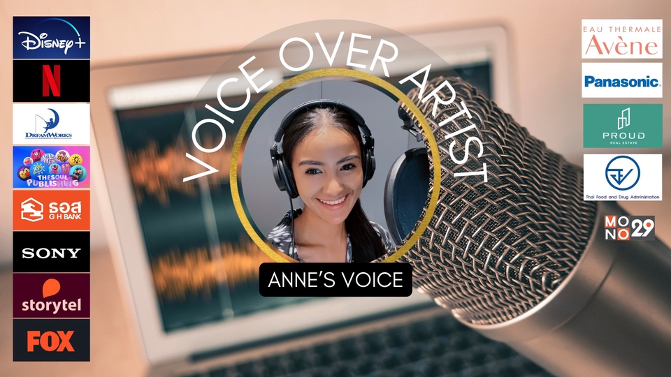 ให้ Anne's Voice เป็นสื่ออธิบายงาน/สินค้าหรือแบรนด์ของคุณกันเถอะค่ะ ด้วยประสบการณ์ลงเสียงพากย์มืออาชีพนานกว่า 8 ปี ให้ลูกค้า Netflix / DisneyPlus / Sony / Marvel / Ads / Audiobook (Storytel) ลูกค้าต่างประเทศผ่านช่อง Youtube ( La La Life) ( Thai Fairy Tales)