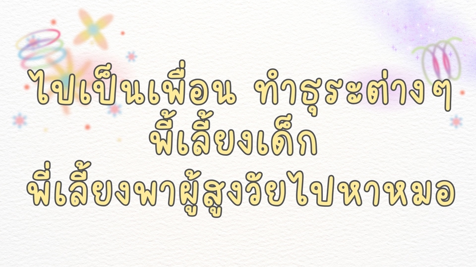 รับไปเป็นเพื่อน หรือรับจ้างพาไปทำธุระต่างๆ พี่เลี้ยงเด็ก พี่เลี้ยงพาผู้สูงวัยไปหาหมอ มีประสบการณ์ดูแลผู้ป่วยสูงวัยเวลา 1 ปี --------------------- มีความอดทน เฟรนลี่ สามารถเข้ากับผู้อื่นได้ง่าย