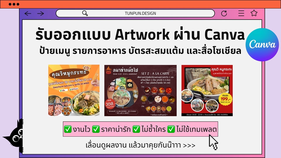 ✅รับออกแบบอาร์ตเวิร์ค โปสเตอร ์ป้ายเมนู รายการอาหาร บัตรสะสมแต้ม และสื่อต่างๆ ผ่าน canva pro ✅งานไว ปรับแก้ได้ ขอแค่แจ้งรายละเอียด ✅ไม่ใช้ Template ทำตามเรฟที่ลูกค้าต้องการ