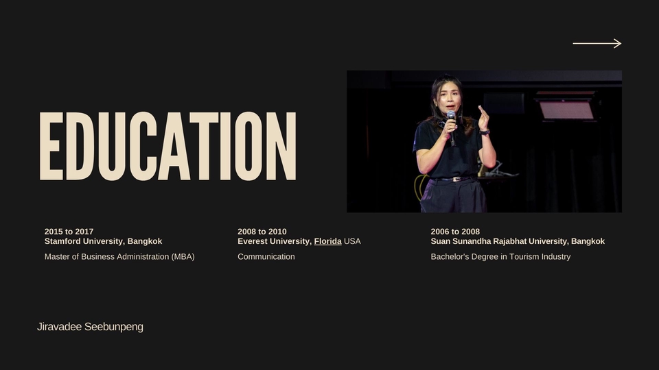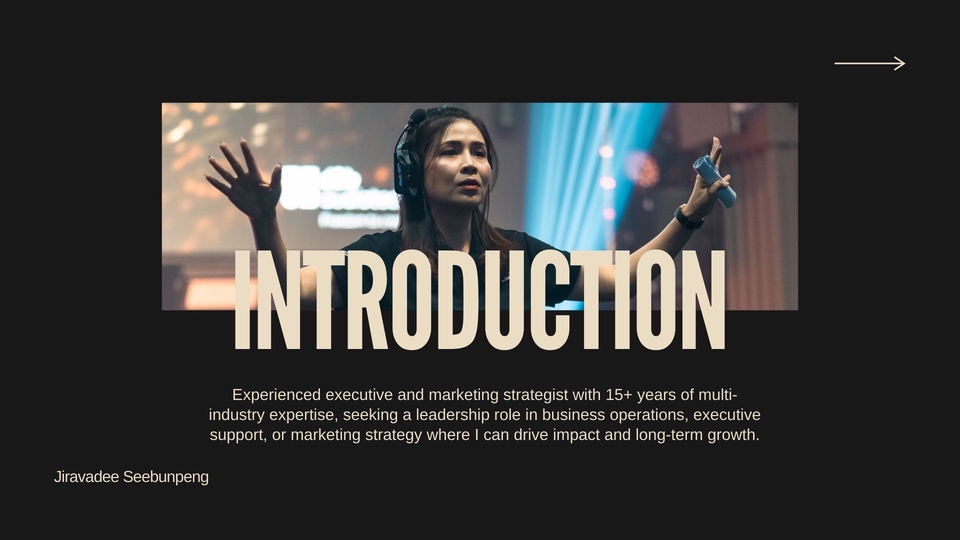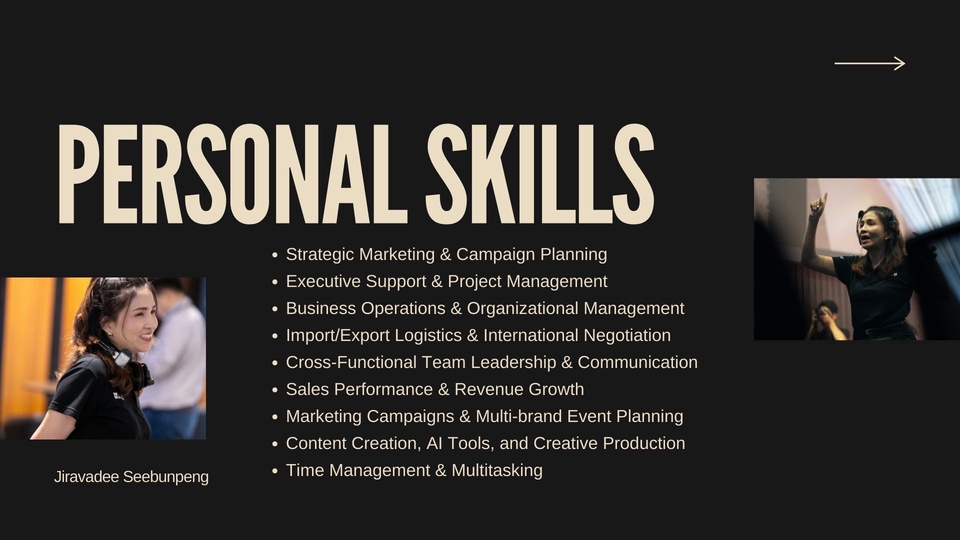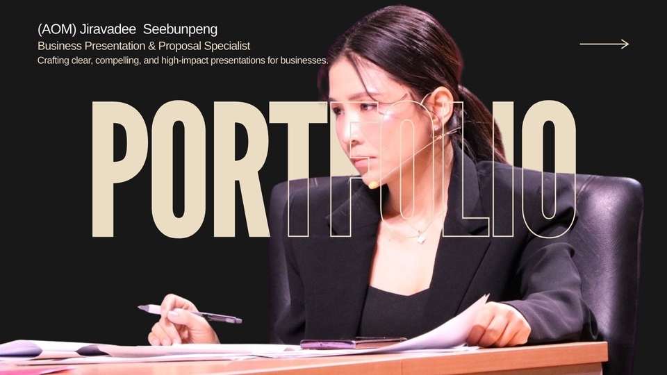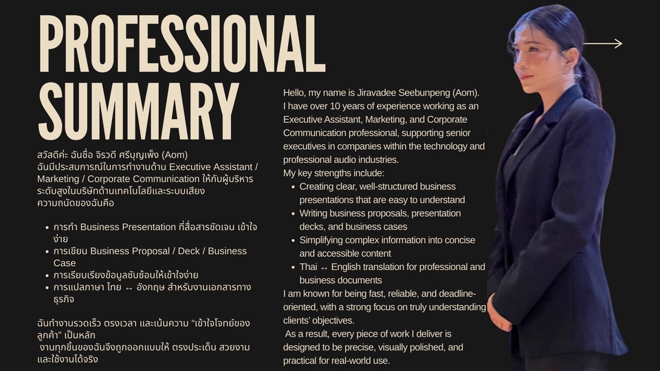 สวัสดีค่ะ อ้อมมีประสบการณ์ในการทำงานด้าน Executive Assistant / Marketing / Corporate Communication ให้กับผู้บริหารระดับสูงในบริษัทด้านเทคโนโลยีและระบบเสียง ความถนัดของอ้อมคือ การทำ Business Presentation ที่สื่อสารชัดเจน เข้าใจง่าย การเขียน Business Proposal / Deck / Business Case การเรียบเรียงข้อมูลซับซ้อนให้เข้าใจง่าย การแปลภาษา ไทย ↔ อังกฤษ สำหรับงานเอกสารทางธุรกิจ ฉันทำงานรวดเร็ว ตรงเวลา และเน้นความ “เข้าใจโจทย์ของลูกค้า” เป็นหลัก งานทุกชิ้นของฉันจึงถูกออกแบบให้ ตรงประเด็น สวยงาม และใช้งานได้จริง