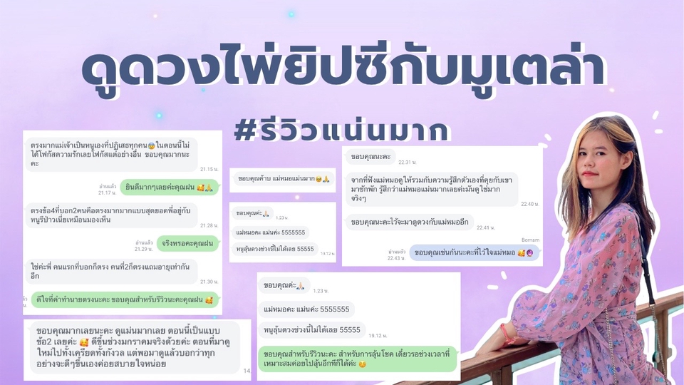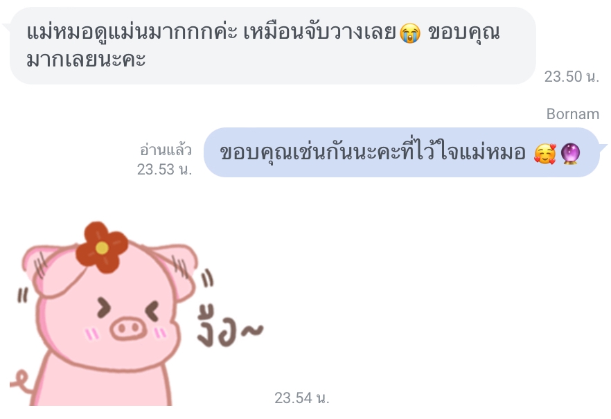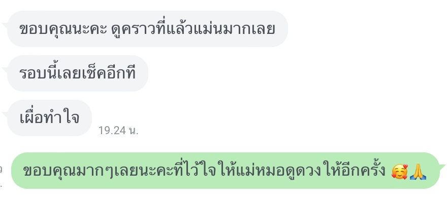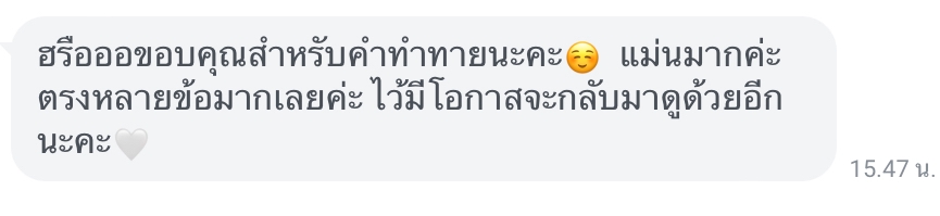 รายละเอียดแบบโทร 🌟ถามกี่คำถามก็ได้ ไม่จำกัด 🌟จองคิวแล้ว ไม่สามารถเลื่อนได้ 🌟หากมาสาย จะไม่ทดเวลาให้ เพราะจะทำให้คิวลูกค้าท่านอื่นเลื่อนไปด้วย ยกตัวอย่างเช่น จอง 21.00-21.30น. หากมาตอน 21.15 จะเหลือเวลาดูเพียง 15 นาทีเท่านั้นค่ะ 🌟มาสายเกิน 25 นาที ขอยกเลิกดูดวงนะคะ และจะไม่คืนค่าครูทุกกรณีค่ะ 🌟หากใกล้ถึงคิว ทางแอดมินจะทักไปบอกล่วงหน้านะคะ เพื่อให้ลูกดวงเตรียมความพร้อมค่ะ 🌟เรื่องที่ไม่รับดูแบบโทร❌ -สิ่งศักดิ์สิทธิ์ เด็กแรกเกิด ผี ไสยศาสตร์ -การเมือง การแข่งขันในเวทีระดับสูง -ของหาย สัตว์เลี้ยงหาย คนหาย -สุขภาพของผู้ป่วยหนัก อายุขัย -การสอบ การแข่งขัน จะบอกเป็น % ค่ะ 🌟เรื่องที่แนะนำ -คำถามเกี่ยวกับการท้องอาจจะคลาดเคลื่อนง่าย หากไม่มั่นใจ แนะนำว่าไม่ควรถามค่ะ ขั้นตอนการทำงาน 1. ลูกค้าทักมาถามแพ็กเกจที่สนใจ 2. ดีลวันและเวลา 3. ลูกค้าชำระเงิน 4. เมื่อถึงเวลา ทางร้านจะแจ้งลูกค้าล่วงหน้า เพื่อให้ลูกค้าเตรียมพร้อม และโทรคุยกัน 5. จบงาน
