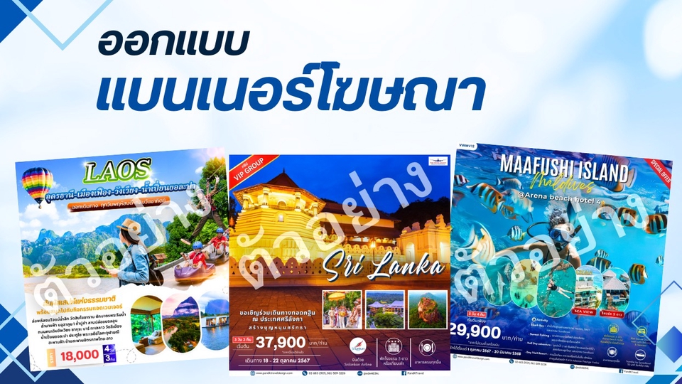 แบนเนอร์โฆษณารูปแบบนี้ จะเน้นการบอกเล่าไฮไลท์หลักที่ต้องการนำเสนอ เช่น สถานที่ท่องเที่ยวที่ไม่ควรพลาดในทริป โดยจะมีรูปหลักตรงกลาง 1 รูป ที่ทางลูกค้าอยากยึดเป็นไฮไลท์หลักที่ต้องการ คำบรรยายและราคาที่มุมซ้ายล่าง และรูปรองที่ลูกค้าอยากเสริมอีก 3 รูปที่มุมขวาล่าง ช่วยให้แบนเนอร์บอกข้อมูลได้อย่างครอบคลุม พร้อมภาพประกอบที่จัดเรียงอย่างพอดี และสบายตา ขั้นตอนการทำงาน 1. ปรึกษากับลูกค้าถึงเป้าหมาย และรายละเอียดของแบนเนอร์ เช่น แบนเนอร์นี้มีไว้เพื่ออะไร? (เช่น โปรโมชันสินค้า, เพิ่มยอดขาย, สร้างการรับรู้แบรนด์) 2. ออกแบบเลย์เอาต์และองค์ประกอบหลัก เช่น หัวข้อ, ข้อความรอง, ภาพหรือกราฟิก 3. ตรวจสอบความสมดุลขององค์ประกอบแบนเนอร์ 4. ส่งให้ลูกค้าตรวจสอบและพิจารณา และยินดีแก้ตามเงื่อนไขในแพ็คเกจ 5. เมื่อลูกค้าพึงพอใจกับผลงานแล้ว จะถือว่าเสร็จสิ้น ไม่มีการแก้ในแบนเนอร์ชิ้นนั้น