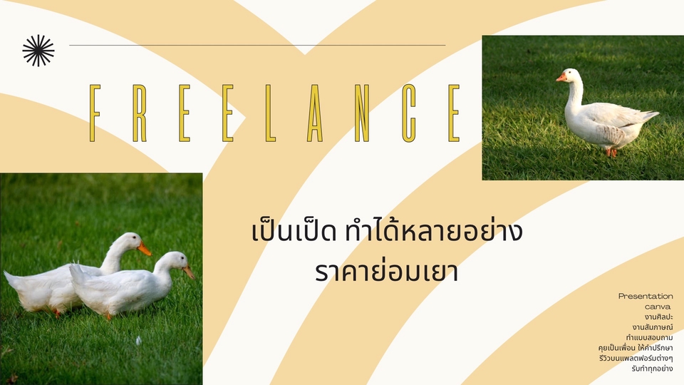 เป็นเป็ดสามารถทำได้หลายอย่างค่ะ ร้องเพลง วาดรูป ภาษา(จีน) คณิตศาสตร์ เล่นดนตรี ทำแบบสอบถาม สัมภาษณ์ คุยเป็นเพื่อนให้คำปรึกษา เป็นเพื่อนเที่ยว กดบัตรคอนเสิร์ต รีวิวร้านบนแพลตฟอร์มต่างๆ ทำพาร์ไทม์ร้านอาหาร ทำบริษัทชิปปิ้งโลจิสติก(ตอบเมลลูกค้า งานเอกสารบัญชี excel ) จัดสต็อคร้านเสื้อผ้า และอื่นๆอีกมากมายค่ะ