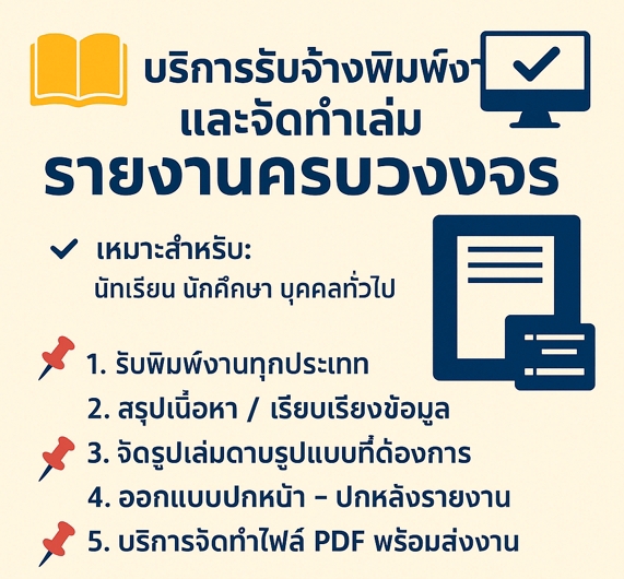 🔧 บริการของเรา: 📌 1. รับพิมพ์งานทุกประเภท รายงานวิชาการ วิทยานิพนธ์ รายงานฝึกงาน พิมพ์เอกสารทั่วไป (.docx / .pdf) พิมพ์ลายมือให้เป็นไฟล์ Word 📌 2. สรุปเนื้อหา / เรียบเรียงข้อมูล สรุปบทเรียน เรียบเรียงรายงานจากข้อมูลดิบ สรุปบทวิจัย/บทความภาษาไทย 📌 3. จัดรูปเล่มตามรูปแบบที่ต้องการ กำหนดระยะขอบ ฟอนต์ หัวกระดาษ ท้ายกระดาษ ทำสารบัญ อ้างอิง และบรรณานุกรม แก้ไขและจัดระเบียบข้อมูลให้น่าอ่าน 📌 4. ออกแบบปกหน้า - ปกหลังรายงาน ปกเรียบง่าย/ปกสวยงามแนวกราฟิก ใส่ชื่อ-รหัสนักศึกษา วิชา อาจารย์ สถาบัน/หน่วยงาน ไฟล์พร้อมสั่งพิมพ์หรือเข้าเล่ม 📌 5. บริการจัดทำไฟล์ PDF พร้อมส่งงาน สำหรับยื่นส่งออนไลน์หรือสั่งพิมพ์ ขั้นตอนการทำงาน 1. ตกลงขอบเขตการทำงาน 2. รับไฟล์งาน 3. จัดทำงานตามตกลง 4. ส่งงาน/แก้ไขงาน ตามครั้งที่กำหนด 5. ส่งงานเป็นไฟล์ Word / PDF