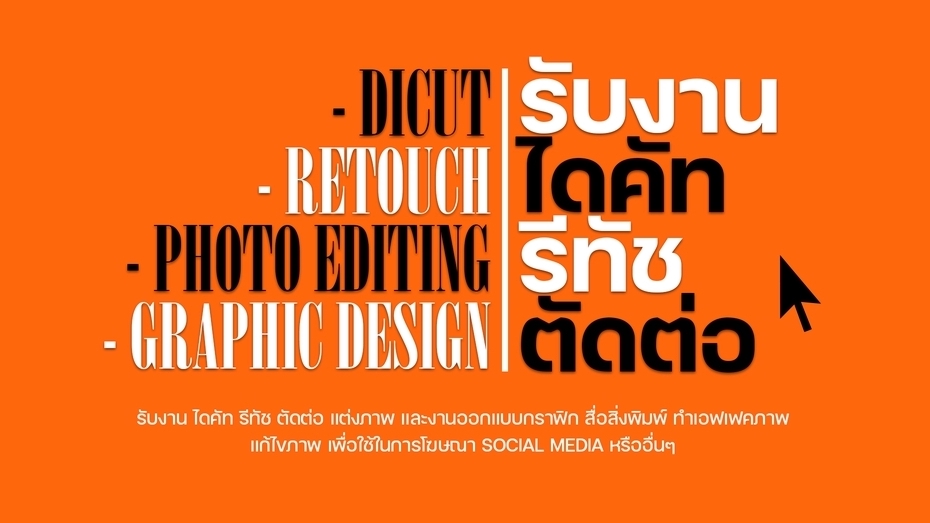 รับงาน ไดคัท รีทัช ตัดต่อ แต่งภาพ แก้ไขภาพ - งานออกแบบกราฟิก, art work ,poster,สื่อสิ่งพิมพ์ ทำเอฟเฟคภาพ แก้ไขภาพ เพื่อใช้ในการโฆษณา Social Media หรืออื่นๆ ขั้นตอนการทำงาน 1. ลูกค้าแจ้ง สิ่งที่ต้องการ รายละเอียด ลักษณะงาน คอนเซ็ปท์ 2. เสนอราคาว่าจ้าง 3. ชำระเงิน 4. ลูกค้าส่งไฟล์ภาพ 5. เริ่มงาน ระยะเวลา ประมาณ 1-2 วัน (หลังจากได้รับไฟล์จากลูกค้า) 6. เสร็จงาน ส่งไฟล์งานให้ลูกค้า ทาง (Google Drive,Line)