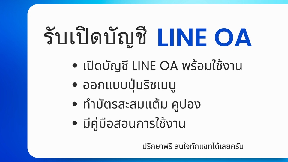 บริการของเรา - รับสร้าง Line OA (Line Official Account) สำหรับธุรกิจอีคอมเมิร์ซ เพื่อเพิ่มแบรนด์ดิ้งและกระตุ้นยอดขาย - รับเปิดบัญชี My Shop เชื่อมต่อกับ Line OA ใช้สำหรับการโปรโมทสินค้าและการตลาดดิจิทัล - รับออกแบบ Rich Menu ช่วยโปรโมทและเพิ่มประสิทธิภาพกลยุทธ์การตลาด - สามารถนัดลงพื้นที่จริง (เฉพาะพื้นที่ในจังหวัดภูเก็ต) เพื่อให้คำปรึกษาด้านการตลาดดิจิทัลและแบรนด์ดิ้ง 📌 Basic Package - 1,390฿ สร้างบัญชี Line OA ใหม่ 1 บัญชี เหมาะกับผู้เริ่มต้นทำอีคอมเมิร์ซ ✅ ตั้งค่าโปรไฟล์ & แบนเนอร์ (เพิ่มแบรนด์ดิ้ง) ✅ ตั้งค่าข้อความต้อนรับ (ช่วยกระตุ้นยอดขายและโปรโมทสินค้า) ✅ ข้อความตอบกลับอัตโนมัติ (ฟรี 3 ชิ้น) ✅ ออกแบบ rich menu (ฟรี 1 ชิ้น) สำหรับการโปรโมทสินค้า ✅ การ์ดเมสเสจหรือริชเมสเสจ (ฟรี 3 ชิ้น) ✅ คูปองส่วนลดหรือบัตรสะสมแต้ม (ฟรี 1 ชิ้น) 📄 แถมฟรี! คู่มือการใช้งานพื้นฐาน (PDF) ครอบคลุมการตลาดดิจิทัลและกลยุทธ์การตลาดผ่าน LineOA 📌 Premium Package - 2,000฿ สร้างบัญชี Line OA ใหม่ 1 บัญชี แถมฟรี Line Premium 1 ปี ช่วยเสริมแบรนด์ดิ้งและกระตุ้นยอดขายระยะยาว ✅ ตั้งค่าโปรไฟล์ & แบนเนอร์ ✅ ตั้งค่าข้อความต้อนรับ ✅ ข้อความตอบกลับอัตโนมัติ (ฟรี 3 ชิ้น) ✅ ออกแบบ rich menu (ฟรี 1 ชิ้น) รองรับการโปรโมทสินค้าและการตลาดดิจิทัล ✅ การ์ดเมสเสจหรือริชเมสเสจ (ฟรี 3 ชิ้น) ✅ คูปองส่วนลดหรือบัตรสะสมแต้ม (ฟรี 1 ชิ้น) 🔥 แถมฟรี! Line Premium ID 1 ปี (ลูกค้ากำหนดชื่อร้านค้าได้เอง เพิ่มแบรนด์ดิ้งและความน่าเชื่อถือ) 📄 แถมฟรี! คู่มือการใช้งานพื้นฐาน (PDF) สำหรับกลยุทธ์การตลาดผ่าน LineOA 💬 ทักแชทสอบถามรายละเอียดเพิ่มเติมได้นะครับ 💬