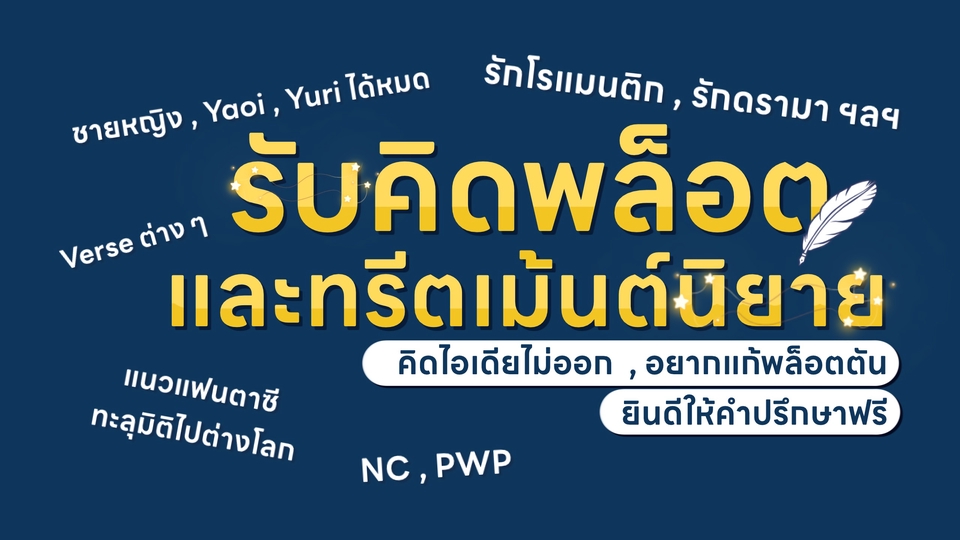 รับคิดพล็อต ออกแบบตัวละครและทรีตเม้นท์นิยาย 💗ถนัดแนว : รักโรแมนติก ดราม่า แฟนตาซี เช่น ซอมบี้,ระบบ,เกิดใหม่ ต่างโลกฯลฯ แนวอื่นก็สามารถพูดคุยกันก่อนได้นะคะ ✅ ชช. / ชญ / ญญ. และอื่นๆ ✅ แฟนฟิค / NC18+ ฯลฯ 💗งานที่รับ : -คิดพล็อตเรื่องสั้น-ยาว -ทรีตเม้นต์นิยาย 💗ยินดีให้คำปรึกษาฟรี หากลูกค้าต้องการคิดพล็อตแต่นึกได้แค่แนวนิยาย เราสามารถแก้ปัญหานั้นได้ค่ะเพียงแชทมาปรึกษากันค่ะ **งานที่นำไปใช้ในเชิงพาณิชย์ราคา +50% ** ขั้นตอนการทำงาน 1. พูดคุยรายละเอียดงาน และตกลงเงื่อนไขราคา 2. เริ่มทำงาน 3. ส่งงานลูกค้าให้ตรวจสอบและแก้ไขงานตามตกลง 4. ส่งงานลูกค้า