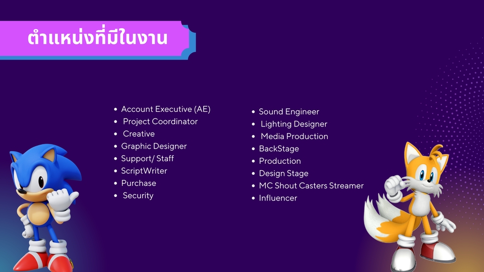 Slides Presentation นี้จะเกี่ยวกับงาน Thailand game show 2022 ซึ่งเนื้อหาใน Slide จะเป็นการวิเคราะห์ว่าในงานมีการจัดงานในรูปแบบไหน มีตำแหน่ง Staff อะไรบ้างที่จำเป็น มี sponsor กี่เจ้า หรือใช้งบเท่าไ่หร่ ซึ่งการออกแบบก็จะให้เข้ากับ Mood & Tone ของธีมงาน และใช้ Element Graphic ที่เกี่ยวข้องกับตะวละครในเกมเพื่อให้เข้าถึงเกมเมอร์ได้ทุกคน ขั้นตอนการทำงาน 1. กำหนด Key message ที่ต้องการสื่อใน Presentation และกลุ่มเป้าหมาย 2. กำหนด Mood & Tone ที่ต้องการ 3. เลือก Color palettes & Typography 4. ออกแบบ Draft แรก 10 หน้าเพื่อดูแนวทางที่ใช่ 5. ปรับแต่ง Slides ให้เนื้อหาและความสวยงามเข้ากันมากที่สุด 6. ออกแบบ Draft 2 เพื่อให้ Slide สมบูรณ์แบบ 7. ปรับเนื้อหาใน Slide ให้ถูกต้อง 8. Recheck งานก่อน Export 9. Export งาน Slide และส่งมอบให้ลูกค้าตรวจเช็ค