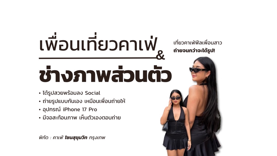 อยากมีรูปสวยๆ ลง SOCIAL แต่ไม่มีคนถ่ายให้? เราคือ “เพื่อนเที่ยวคาเฟ่” ที่จะพาไปถ่ายรูปเก๋ๆ ในคาเฟ่โซนสุขุมวิท 📸 ช่วยหาเรฟท่าโพส หาเรฟชุด แนะนำคาเฟ่ ถ่ายรูปให้ไม่อั้น และส่งรูปให้ในวันนั้นเลย! ✨เหมาะกับสายคาเฟ่ สายคอนเทนต์ หรือใครที่อยากมีวันชิลๆ พร้อมภาพสวยๆ เก็บไว้ 💐 ใช้อุปกรณ์ iPhone 17 Pro + จอสะท้อนภาพ ลูกค้าจะเห็นตัวเองระหว่างถ่าย ได้มุมสวยทุกช็อต 💓 ☕ รายละเอียดบริการ • พิกัดหลัก: คาเฟ่ในโซนสุขุมวิท กรุงเทพฯ • ราคาทุกแพ็กเกจ รวมค่าเดินทางและค่าคาเฟ่ส่วนของฟรีแลนซ์แล้ว • ลูกค้าสามารถเลือกร้านเอง หรือให้เราช่วยแนะนำได้ • ได้ภาพทั้งหมดแบบ Original ในวันนั้นเลย (หรือภายใน 1–2 วัน ตามแพ็กเกจ) • ถ่ายด้วย iPhone 17 Pro + หน้าจอสะท้อนภาพ เห็นตัวเองระหว่างถ่าย • คิดท่าโพสให้ / หาเรฟ moodboard ก่อนวันจริง • เลทได้ไม่เกิน 10 นาทีค่ะ 🕐 📸 ขั้นตอนการจองงาน 1. ทักแชทเพื่อคุยคอนเซปต์ (แนวภาพ / คาเฟ่ / การแต่งตัว) 2. ยืนยันวัน เวลา และคาเฟ่ที่ต้องการ 3. โอนจองผ่านระบบ Fastwork เพื่อยืนยันคิว 4. รอรับ moodboard / เรฟโพส / เรฟชุด ก่อนวันถ่าย 5. ไปคาเฟ่ด้วยกัน & เก็บภาพสวยๆ 💕 6. รับภาพ (หรือวิดีโอ) ภายในวันนั้นหรือ 1–2 วัน 📩 หมายเหตุสำคัญ • รับเฉพาะลูกค้าเพศหญิง และสาวประเภทสอง / เพศที่สามเท่านั้นค่ะ *ขออภัย ไม่รับลูกค้าเพศชาย เพื่อความปลอดภัยและความสบายใจของทั้งสองฝ่าย* • รับงานช่วงเวลา 09:00-18:00 น. • กรุณานัดล่วงหน้าอย่างน้อย 2–3 วัน • หากต้องการต่อเวลา คิดเพิ่ม 800 บาท/ชม. หรือ 400 บาท/30นาที • เวลาที่จองเริ่มนับตั้งแต่เวลานัดเจอกันที่คาเฟ่ • หากมาสายเกิน 10 นาที เวลาจะถูกนับตามเวลาจริง • ลูกค้ารับผิดชอบค่าใช้จ่ายส่วนตัว เช่น อาหาร/เครื่องดื่มของตนเอง