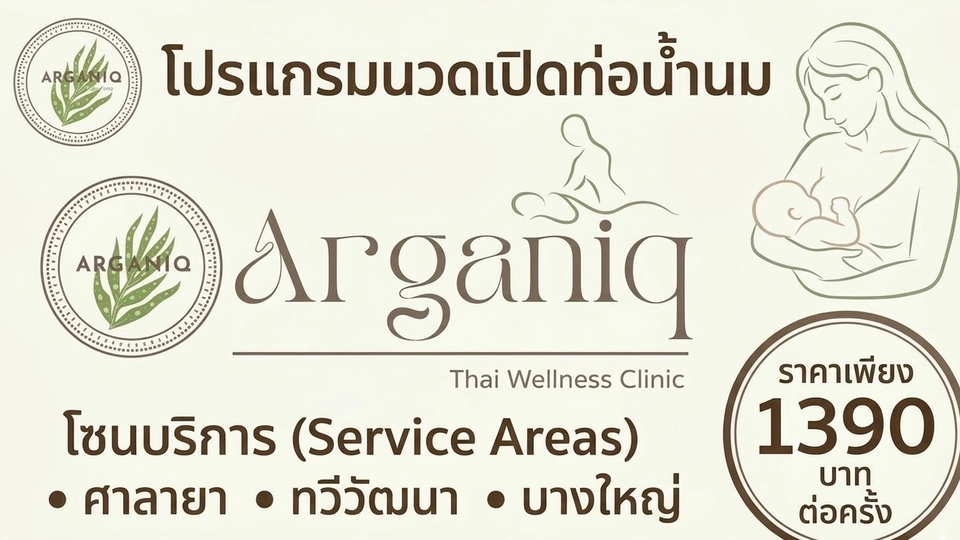 นวดเปิดท่อน้ำนม 60 นาที นวดกระตุ้นและเปิดท่อน้ำนมโดยผู้เชี่ยวชาญ ช่วยลดอาการคัดตึง เต้านมแข็ง ลดความเสี่ยงท่อน้ำนมอุดตัน กระตุ้นการไหลเวียนของน้ำนมอย่างอ่อนโยนและปลอดภัย "Arganiq Thai Wellness Clinic | นวดไทย บำบัดออฟฟิศซินโดรม อยู่ไฟหลังคลอด โดยแพทย์แผนไทย (บางกรวย-นนทบุรี) Arganiq Thai Wellness Clinic คลินิกดูแลสุขภาพแบบองค์รวม ผสานศาสตร์แพทย์แผนไทยดั้งเดิมกับการดูแลสมัยใหม่ เราเน้นการ “ประเมินก่อนรักษา” ทุกเคส โดยผู้มีใบประกอบวิชาชีพ เพื่อให้การดูแลมีความปลอดภัย เหมาะสม และตรงจุด 🌿 บริการหลักของเรา • นวดไทยผ่อนคลาย • รักษาออฟฟิศซินโดรมโดยแพทย์แผนไทย • นวดคนตั้งครรภ์ • นวดเปิดท่อน้ำนม • คอร์สอยู่ไฟหลังคลอด • โปรแกรมฟื้นฟูแบบองค์รวม + ประคบสมุนไพร จุดเด่นของ Arganiq ✔ ประเมินก่อนทำหัตถการทุกครั้ง ✔ ใช้สมุนไพรคุณภาพจากแหล่งผลิตโดยตรง ✔ บรรยากาศคลินิกสะอาด อบอุ่น เป็นส่วนตัว ✔ ไม่ใช่ร้านนวดทั่วไป แต่เป็นคลินิกสุขภาพ เงื่อนไขการใช้บริการ • เปิดให้บริการทุกวัน (กรุณาจองล่วงหน้า) • บางโปรแกรมต้องประเมินโดยแพทย์แผนไทยก่อน • กรณียกเลิก กรุณาแจ้งล่วงหน้าอย่างน้อย 4 ชั่วโมง