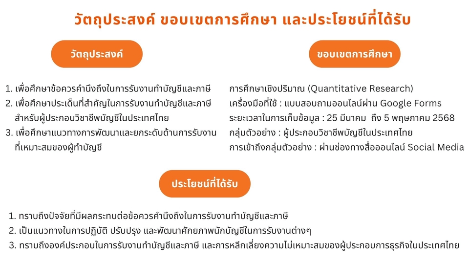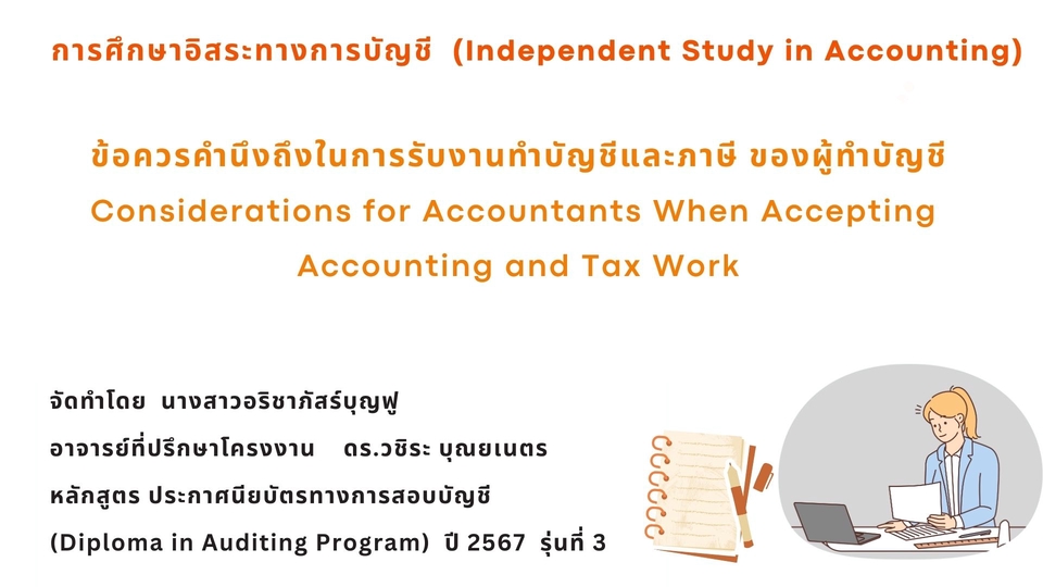 * ที่ปรึกษาบัญชีและภาษี โดยใช้โปรแกรม Smart Biz โปรแกรม Peak Account และ Microsoft Excel รับทำงานบัญชี ตรวจสอบบัญชี จดทะเบียนต่างๆ ยื่นภาษี ปิดงบการเงิน * ทำไฟล์เสนองานขายที่ดินยื่นนายทุน (สำหรับนายหน้าค้าที่ดิน) โปรแกรม Powerpoint และ PDF * พิมพ์รายงานบทความต่างๆ โดยใช้โปรแกรม Microsoft Word & Excel * ออกแบบงานสื่อสิ่งพิมพ์ โดยใช้โปรแกรม Canva และ ACDsee Photo Studio